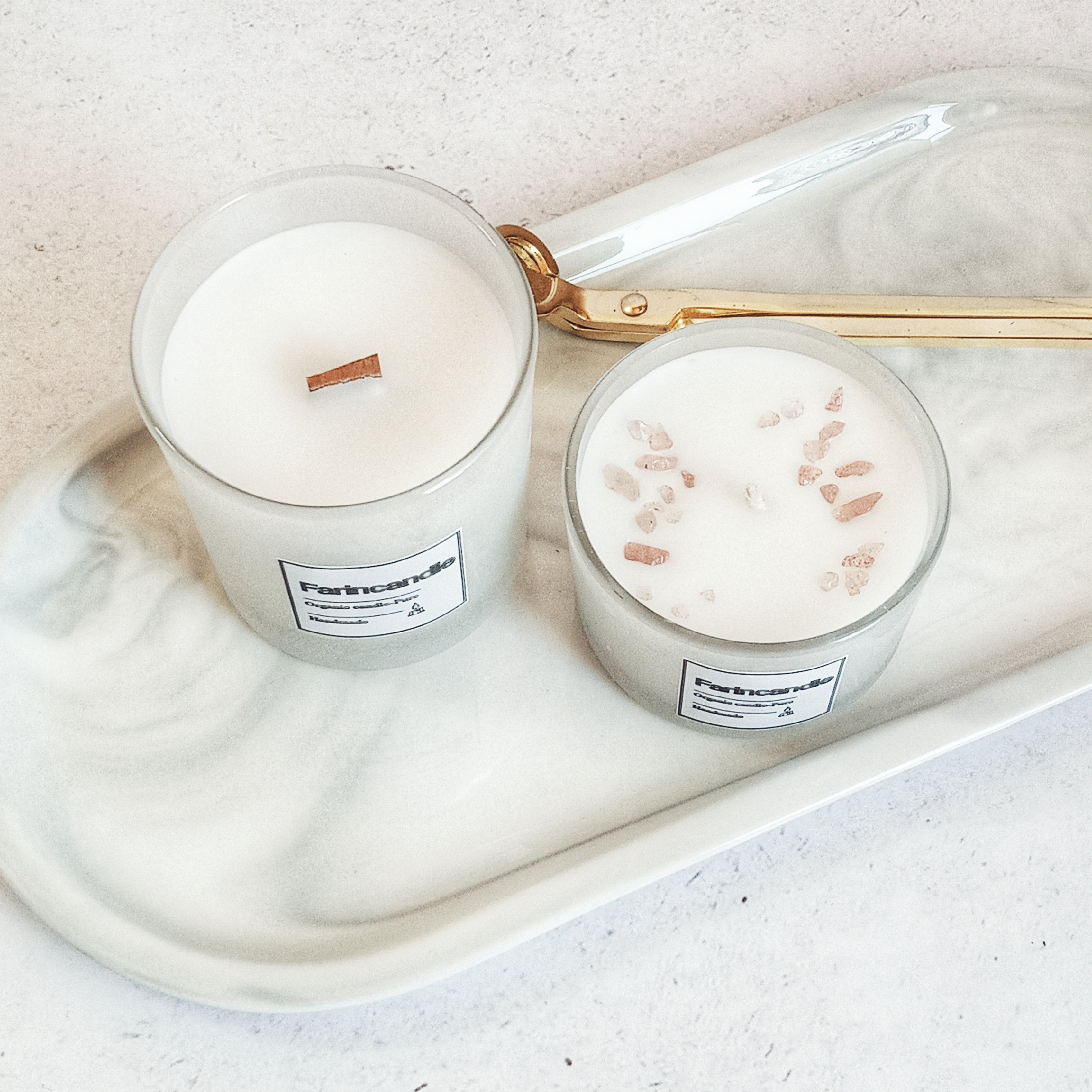 شمع گیاهی معطر با شیشه یخی و درب چوبی با تزئین سنگهای جذاب طبیعی تهیه شده از موم طبیعی سویا با رنگهای متنوع، پاستلی، سفارشی و دلخواه