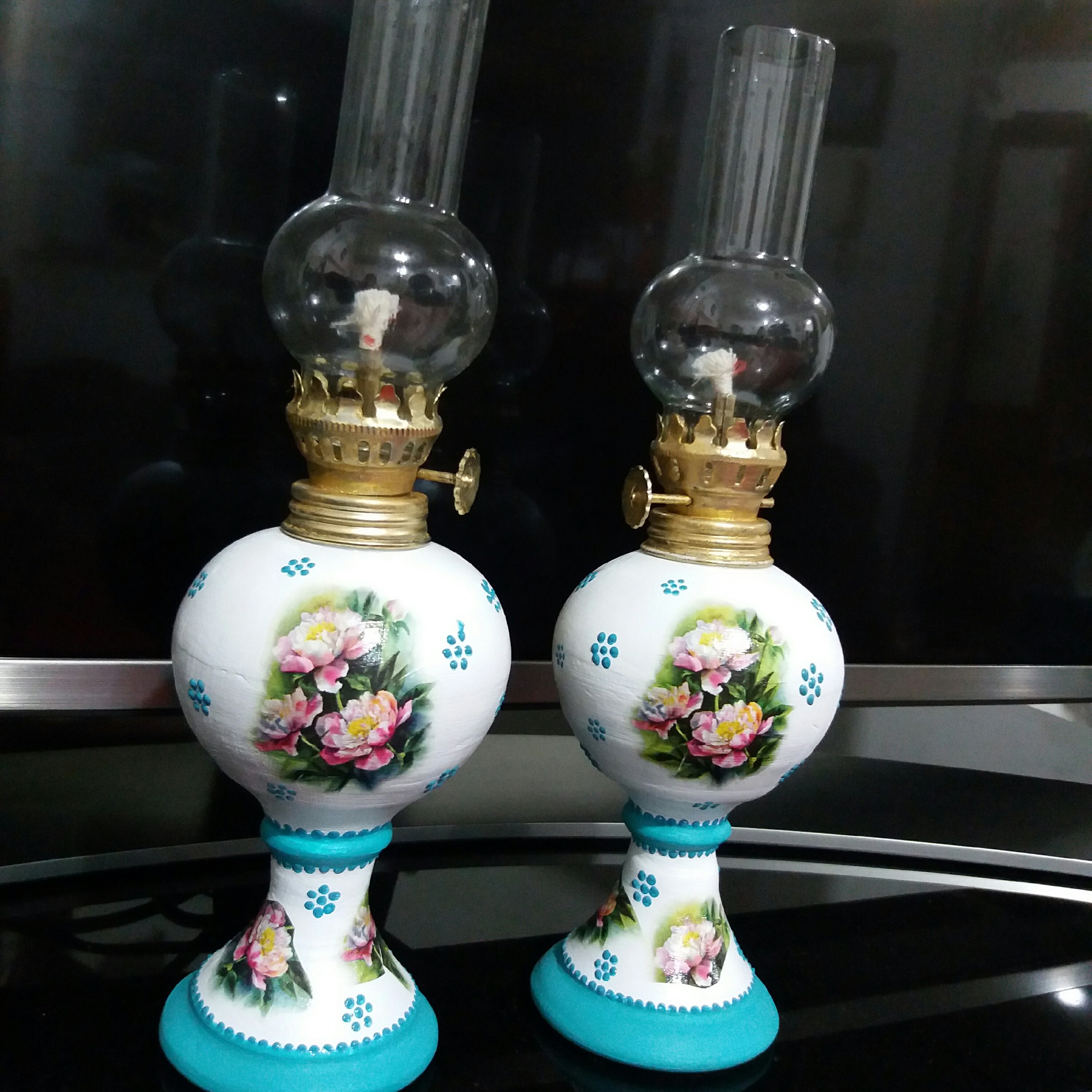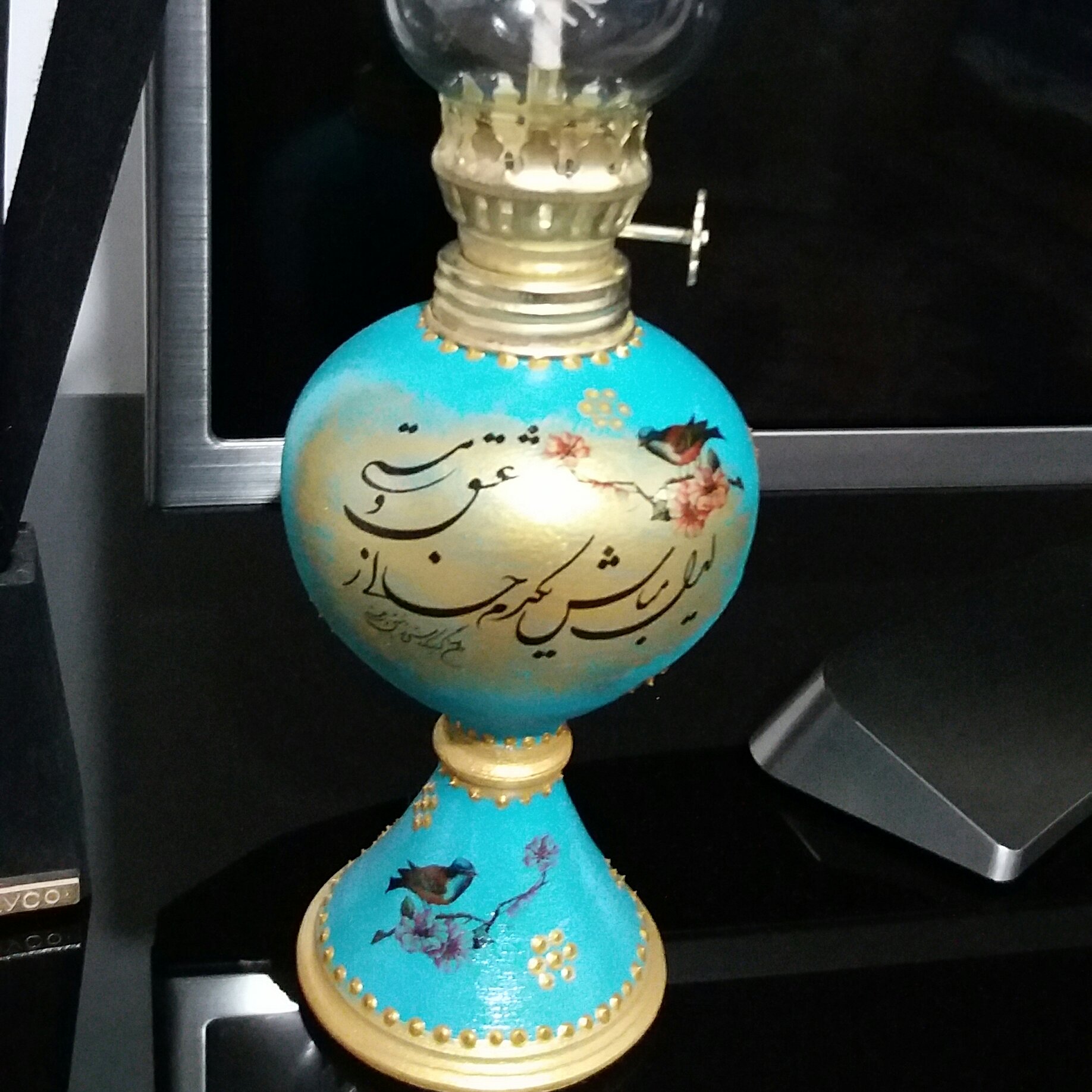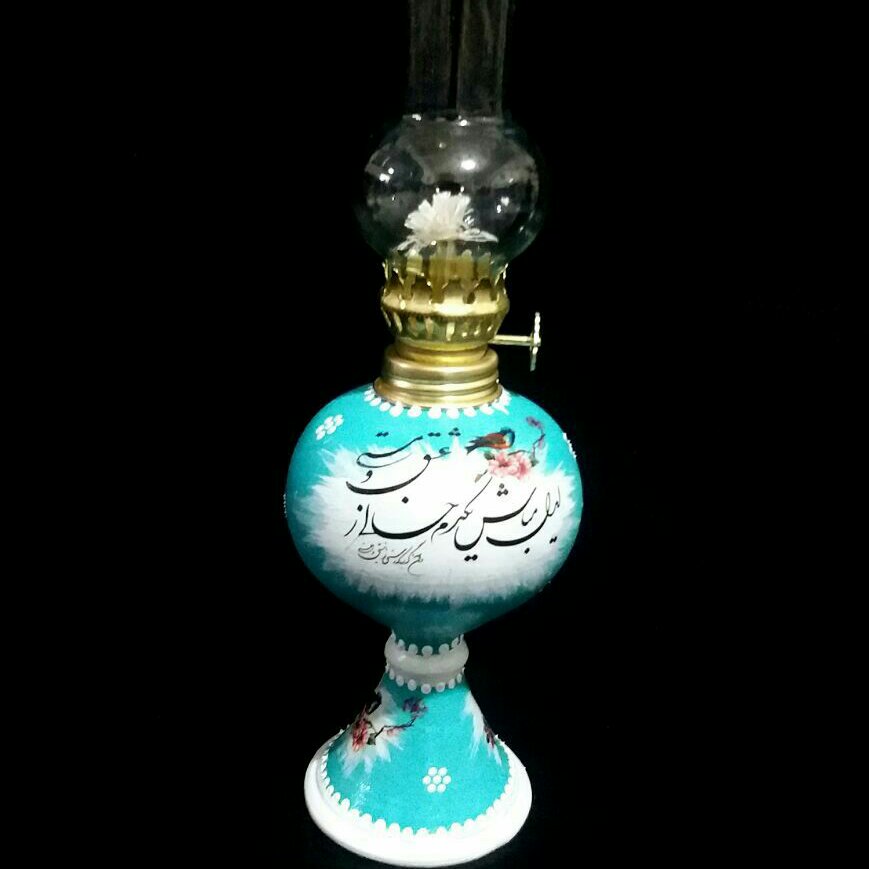 سایز متوسط ، به ارتفاع حدوداً28یا30سانتی که قابل روشن شدن با نفت یا الکل ،اما بعلت کمیاب بودن فیتیله بهتر است بعنوان دکوری استفاده شود. طرح ترانسفر ،رنگ به دلخواه مشتری.