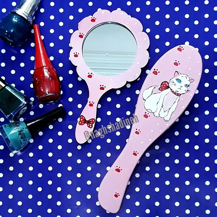 نقاشی با دست آینه و برس چوبی طرح گربه به سفارش مشتری قابل شستشو میتونید با شانه و جعبه هدیه ست کنید هدیه عالی برای دختران عزیزمون