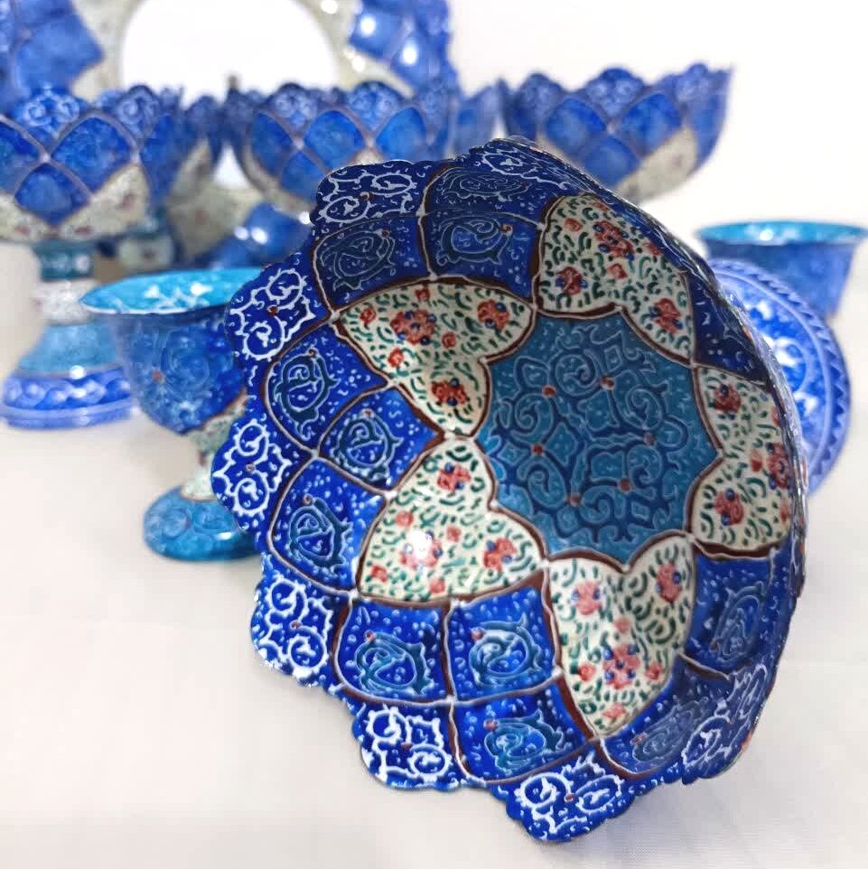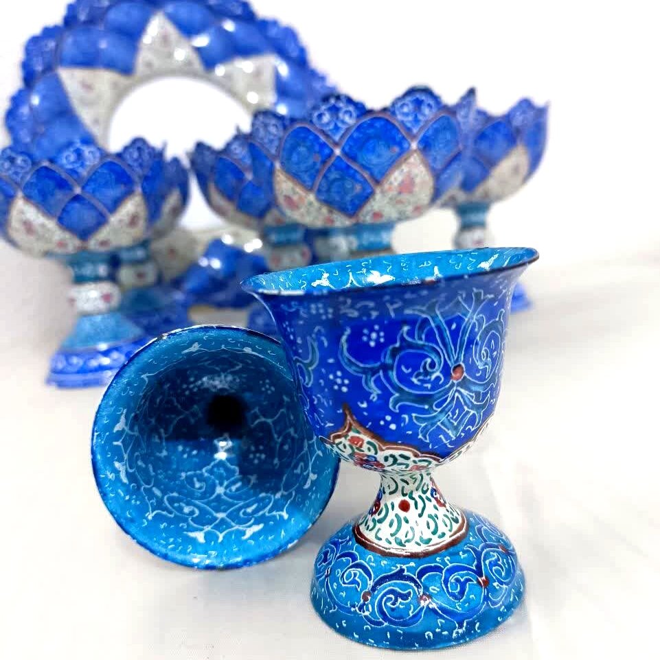 هفت سین پایه دار مینا کاری: 🔸6عدد کاسه ی پایه دار به ارتفاع12سانت وقطر دهانه10سانت،قطرکاسه باگودی16سانت 🔸2عددشمعدان به ارتفاع7سانت 🔸آینه به قطر30سانت جنس محصول مسی،قابل شستشو وضدخش ازکاسه پایه دارهابه عنوان ظرف آجیل خوری هم میتوان استفاده کرد. لطفا قبل از ثبت سفارش ازطریق غرفه دار ازموجودی محصول مطمعن شوید