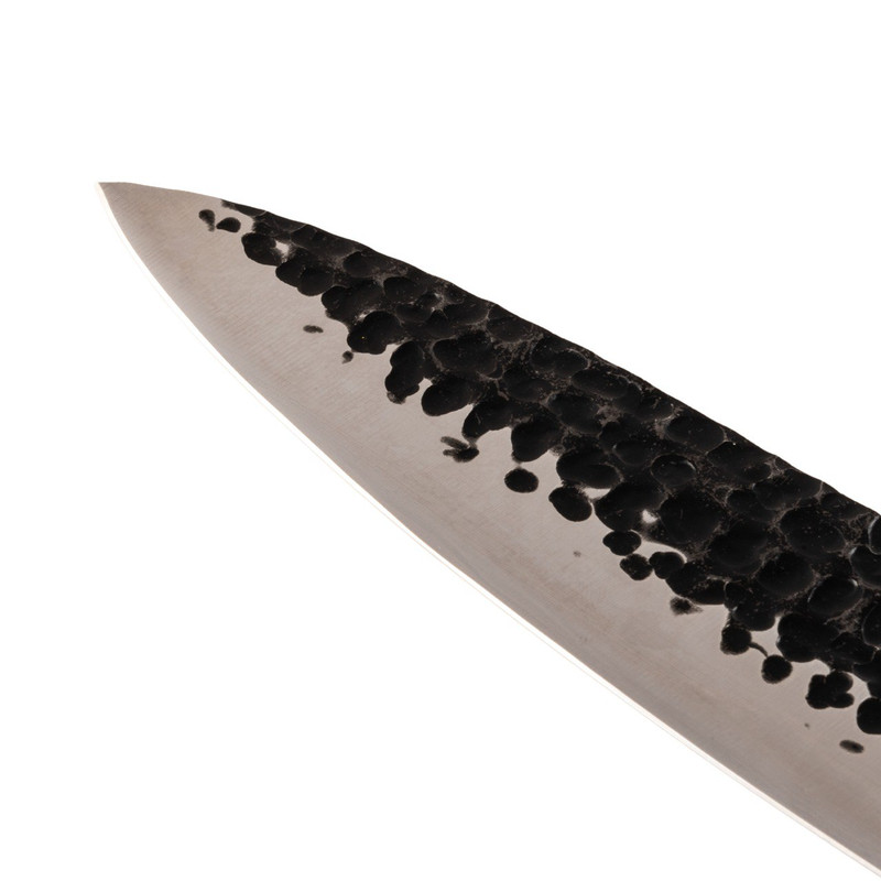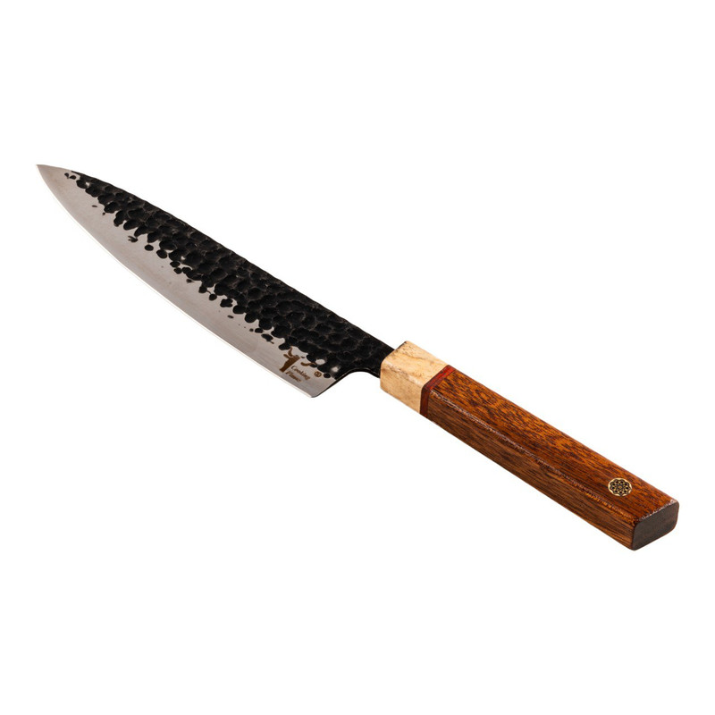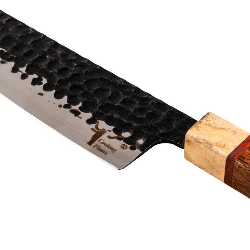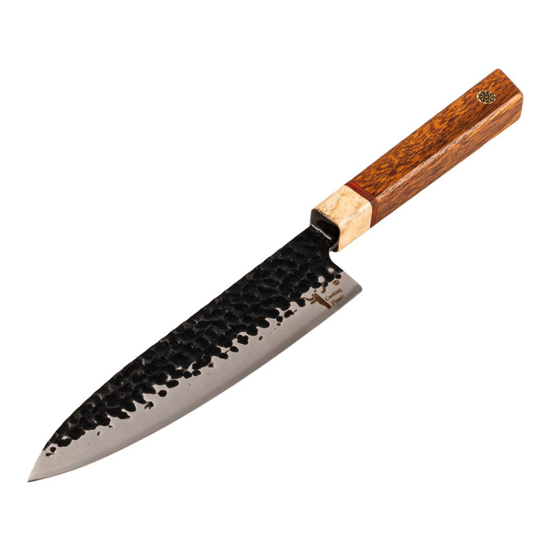 چاقو با تیغه فولاد ژاپنی با تیغه فورج شده از فولاد ضد زنگ 5Cr15MoV ساخته شده، یک انتخاب عالی برای سرآشپزها، ورانها و هتلها است. این چاقو با طراحی حرفهای و ویژگیهای منحصر به فرد خود، توانسته به عنوان یک ابزار کارآمد و مقاوم، تجربهای عالی در آشپزی حرفهای به ارمغان آورد. ویژگیهای چاقو تیغه فولادی: - فولاد ضد زنگ 5Cr15MoV: فولاد 5Cr15MoV یک فولاد ژاپنی است که به ل داشتن مقدار مناسب کروم، مقاومت بالایی در برابر خوردگی دارد. این فولاد علاوه بر سختی 52±2 راکول C، در برابر فرسایش و زنگ زدگی مقاومت زیادی از خود نشان میدهد و باعث افزایش طول عمر چاقو میشود. - تیز کردن آسان: این چاقو به راحتی با ابزارهای مناسب تیز میشود، که این ویژگی برای محیطهای شلوغ و پرکار مانند ورانها و هتلها اهمیت زیادی دارد. این ویژگی نیاز به نگهداری مداوم را کاهش میدهد و به سرآشپزان این امکان را میدهد که به راحتی تیغه را در وضعیت ایدهآل نگه دارند. - مقاومت در برابر ضربه: این چاقو علاوه بر مقاومت در برابر خوردگی، قادر به تحمل ضربات و نیروهای جانبی است. بنابراین، در محیطهای حرفهای مانند آشپزخانههای ورانی، جایی که ممکن است فشار و ضربات زیادی به چاقو وارد شود، عملکرد بینظیری خواهد داشت. - دسته چوبی: دسته چاقو از ترکیب چوب ساج آفریقایی، رز برزیلی و افرا با کیفیت بالا و مقاومت عالی در برابر مواد خوراکی، اسیدها و قارچها ساخته شده است.این چوب ها جزو چوب های گران قیمت در جهان هستند که دسته لایق این تیغه را به وجود آورده اند. دسته چوبی 8 ضلعی علاوه بر حفظ اصالت چاقوهای ژاپنی دارای استحکام بالایی هستند که تجربهای راحت و نومیک برای کاربر به ارمغان میآورد و در استفادههای طولانیمدت خستهکننده نمیشود. - عملیات فورج (چکشکاری): چاقوی سرآشپز با عملیات فورج ساخته شده است که باعث میشود تیغه از سختی بالا و استحکام بالایی برخوردار باشد. این عملیات علاوه بر بهبود عملکرد مکانیکی، ظاهری زیبا و منحصر به فرد به چاقو میدهد. -غلاف چرمی: ساخته شده از چرم طبیعی گاو و دست دوز شده. چرا سرآشپزهای حرفه ای، ورانها و هتلها باید این چاقو را بخرند؟ - مقاومت در برابر شرایط کاری سخت - افزایش بهرهوری و کارایی در آشپزخانهها - ظاهر شیک و مدرن - آسانی در نگهداری