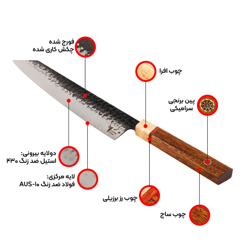 چاقوی سان مای از یک لایه سخت مرکزی با تیغه فولادی ژاپنی AUS-10 و طراحی دو لایه استیل ۴۳۰ در دو طرف هسته یکی از بهترین انتخابها برای کافهها، ورانها و هتلها است. این چاقو به ل ترکیب ویژگیهای برجسته و کیفیت عالی، ابزاری بینظیر برای سرآشپزان حرفهای و علاقهمندان به آشپزی است. ویژگیهای چاقوی سان مای: - تیغه فولادی ژاپنی AUS-10 با سختی 60 HRC: فولاد AUS-10 که از معتبرترین فولادهای ژاپنی است، ترکیب میشود تا چاقویی با لبهای بسیار تیز و مقاوم در برابر فرسایش تولید کند. این ویژگی باعث میشود که چاقو تا مدتها تیز بماند و نیاز به تیز کردن مکرر نداشته باشد. - دو لایه استیل ۴۳۰ برای افزایش انعطافپذیری: دو لایه استیل علاوه بر افزایش مقاومت در برابر خوردگی و سایش، به چاقو انعطافپذیری بالایی میبخشد و به راحتی میتوانید از آن برای انواع کارهای آشپزی استفاده کنید. - مقاومت در برابر زنگ زدگی و سایش: ترکیب کروم، مولیبدن و وانادیوم در فولاد AUS-10، مقاومت بالای چاقو در برابر خوردگی و زنگ زدگی را تضمین میکند و دوام و عمر مفید طولانی را برای استفادههای روزمره در ورانها، کافهها و هتلها فراهم میآورد. - عملیات فورج برای بهبود عملکرد: چاقوی سان مای با عملیات چکشکاری به دقت و زیبایی ساخته میشود که علاوه بر ظاهر جذاب، سختی و عملکرد بهتری نیز به چاقو میبخشد. این عملیات کمک میکند که مواد غذایی به راحتی از سطح تیغه جدا شوند. دسته چوبی: دسته چاقو از ترکیب چوب ساج آفریقایی، رز برزیلی و افرا با کیفیت بالا و مقاومت عالی در برابر مواد خوراکی، اسیدها و قارچها ساخته شده است.این چوب ها جزو چوب های گران قیمت در جهان هستند که دسته لایق این تیغه را به وجود آورده اند. دسته چوبی 8 ضلعی علاوه بر حفظ اصالت چاقوهای ژاپنی دارای استحکام بالایی هستند که تجربهای راحت و نومیک برای کاربر به ارمغان میآورد و در استفادههای طولانیمدت خستهکننده نمیشود. غلاف چرمی: ساخته شده از چرم طبیعی گاو و دست دوز شده. مزایای استفاده برای کافهها و ورانها: - عملکرد بینظیر در محیطهای پر استفاده: - سهولت استفاده و نومی عالی: - مقاومت در برابر شرایط سخت آشپزی - ظاهر شیک و جذاب - مناسب برای خرد کردن، برش زدن و چاکزنی انواع مواد غذایی از جمله گوشت، ماهی، سبزیجات و میوهها.