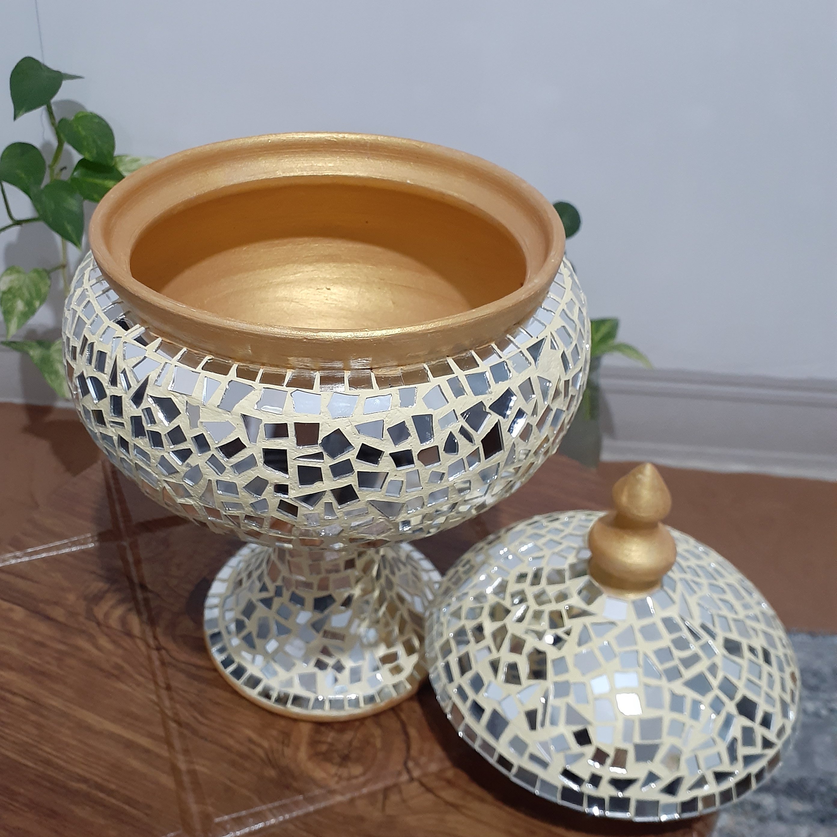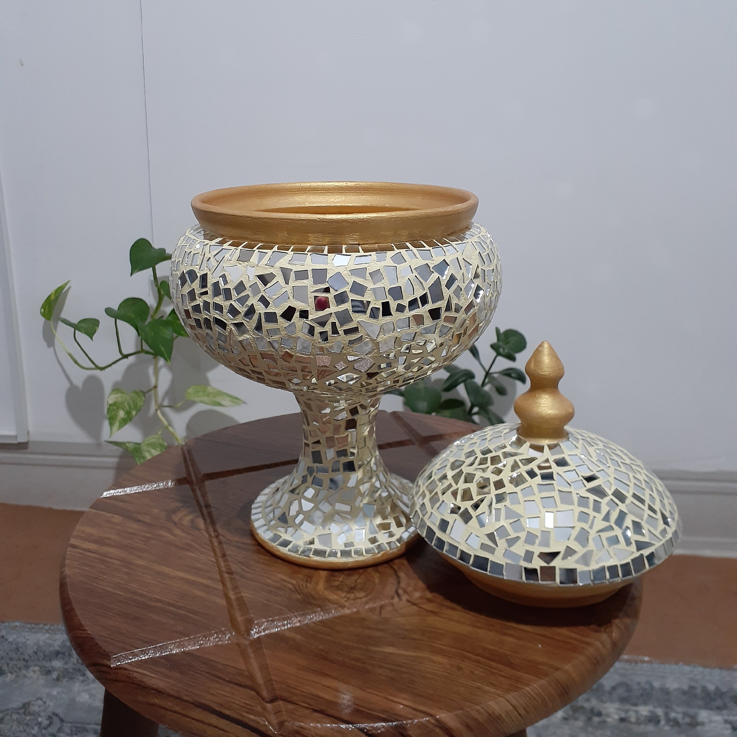 شکلات خوری پایه دار تماما آینه کاری شده به رنگ طلایی ولی قابل تغییر سایز متوسط و قابل شستشو با دستمال نمدار بسیار تمیزو ظریف👌