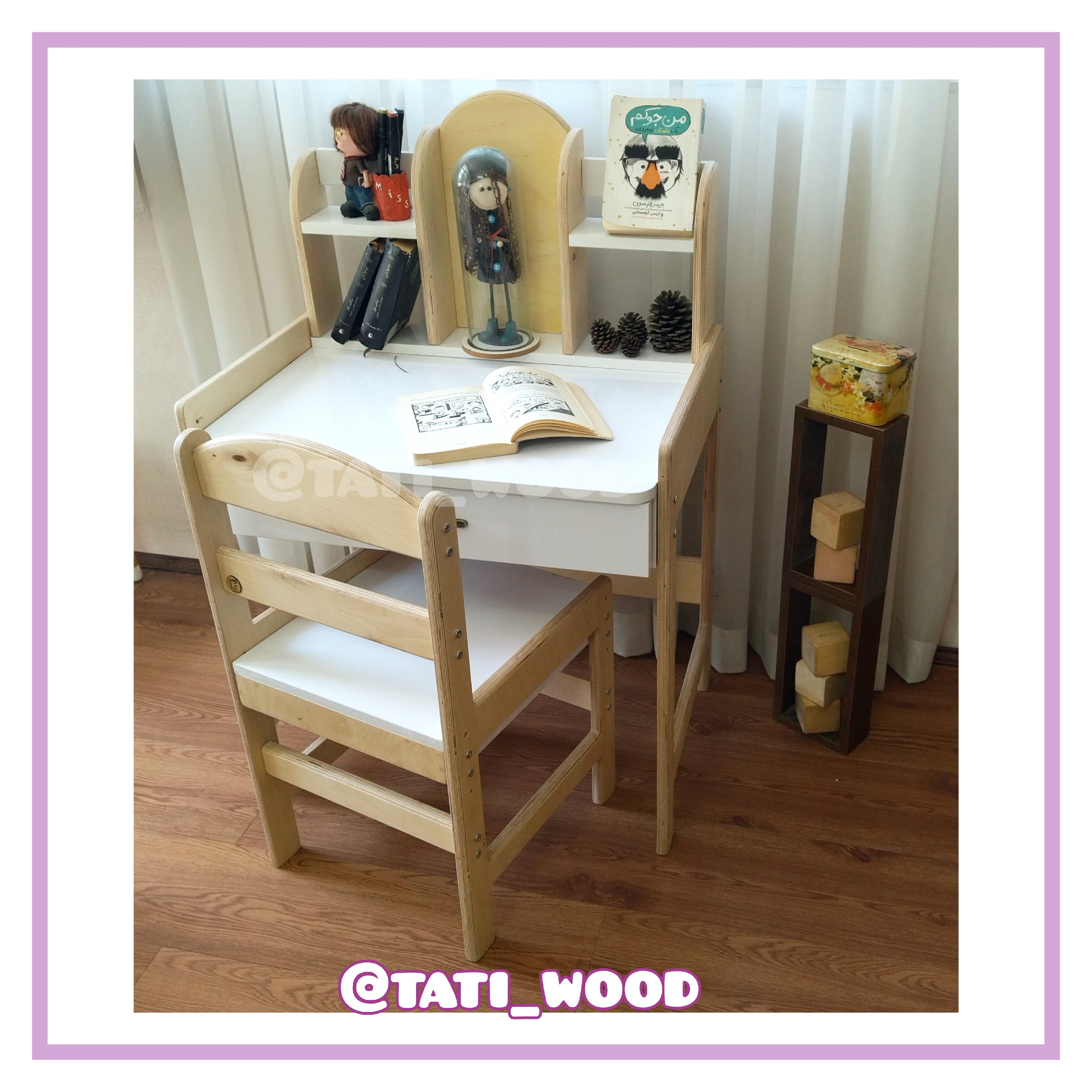 میز و صندلی تحریر تنظیم ارتفاعی، قابلیت تنظیم در سه سایز ارتفاعی ، کشوی ریلی روان، با قابلیت مونتاژ آسان، قابل سفارش در دو رنگ چوب روشن و تیره