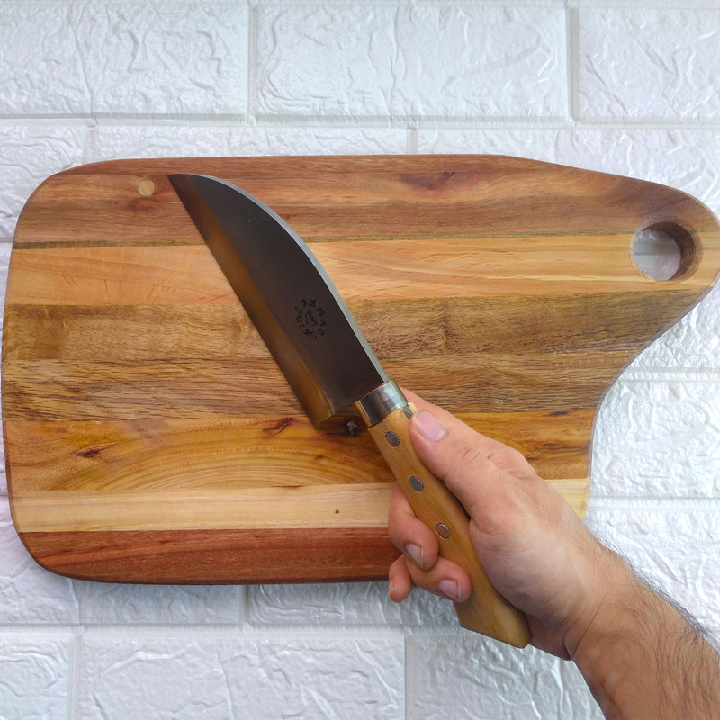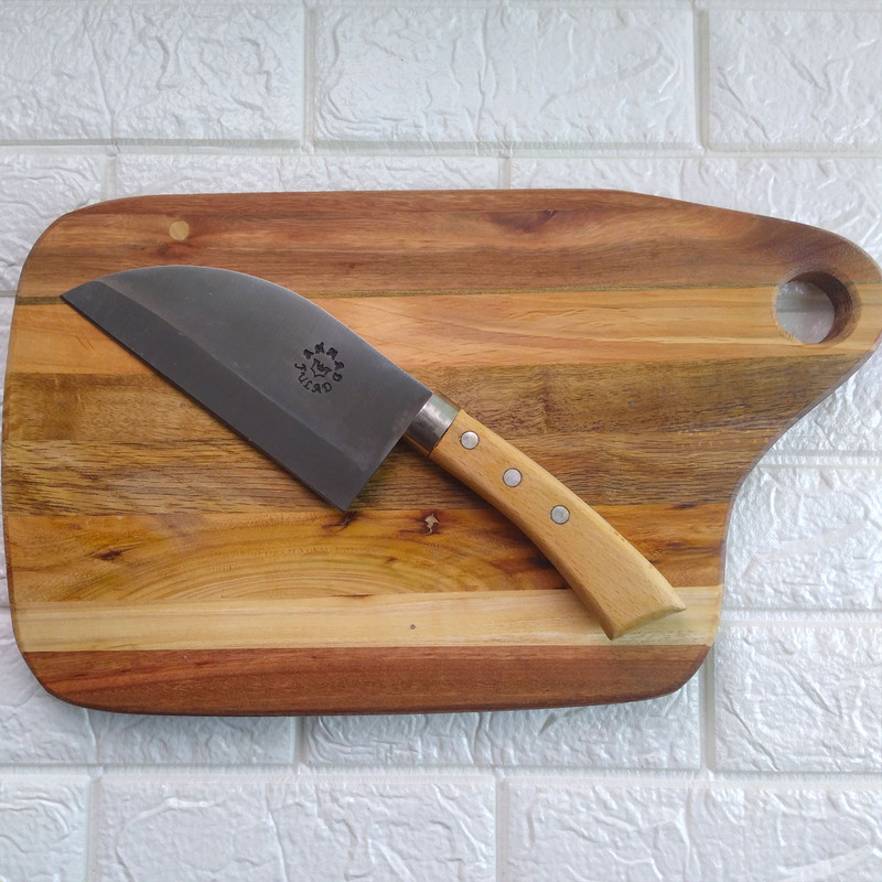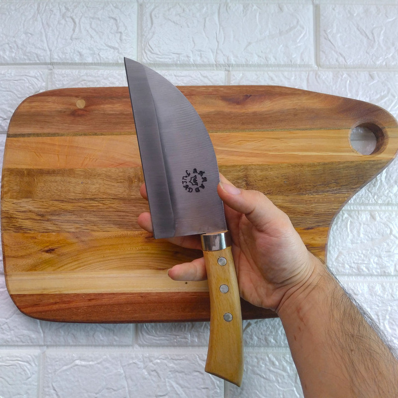 فک نکنیم این مدل نیاز به معرفی داشته باشد! چاقوی سرآشپز مدل صربستانی م که در مستند آشپزی در طبیعت به احتمال بسیار زیاد مشاهده کرده اید و چاقویی با طراحی خاص و زیبایی میباشد که طراحی آن به ساتورهای قصابی بسیار شباهت دارد ولی این محصول ساتور نیست و برای استخوان نباید مورد استفاده قرار گیرد بلکه سرتاسر تیغه به شدت تیز و نازک میباشد و برای انجام برش و آشپزی کردن بر روی تخته کار و تخته گوشت مورد استفاده قرار میگیرد و برای خرد کردن پیاز و سبزی و گوشت باید مورد استفاده قرار گیرد.طول کل این چاقوی سرآَپز صربستانی 32 سانتیمتر میباشد و شما از این 32 سانتیمتر 17 سانتیمتر در تیغه دارید و 14 سانتیمتر در دسته و 7 سانت نیز عرض تیغه ی این چاقوی سرآشپز میباشد از درجه کیفی و ساخت بسیار بالایی بهره میبرد و جز چاقوهای صربستانی خوش ساخت و عالی مجموعه چاقوی میباشد. اگر طبیعتگرد هستید و علاقه مند هستید هرازگاهی دل به طبیعت و گردش بزنید و دوست دارید در طبیعت نیز آشپزی کنید این چاقو صربستانی میتواند عضوی عالی برای شما در گردش ها باشد و به این چاقو لذت آشپزی را دو چندان کنید کیفیت ساخت بالا کاملا دستساز بودن دیگر به چیزی احتیاج نخواهید داشت. فولاد پرکربن به شما همیشه قدرت بالاتری نسبت به فولادهای نیکل دار و نیکل بالا میدهد ولی در مقابل رطوبت و مایعات دچار واکنش میشود و زنگ میزند حتما دقت کنید هنگام استفاده و هنگام نگهداری تیغه به مقدار کمی روغن پارافین آغشته باشد تا لکه و مایعات نتواند بر روی تیغه نفوذ کنند و موجب زنگ زدن شوند! اگر غفلت کردید و تیغه دچار زنگ زدگی شد میتوانید در روزهای اول با جلاسنج این زنگ زدگی را رفع کنید دقت کنید هر زمان تیغه کثیف شد سریعا تیغه را شسته و سریعا نیز تیغه را کاملا خشک و آغشته به چربی کنید. هر وسیله ای نیاز به استفاده اصولی و نگهداری اصولی دارد و چاقو نیز کاملا به مراقبت اصولی و استفاده اصئلی شما نیاز دارد.