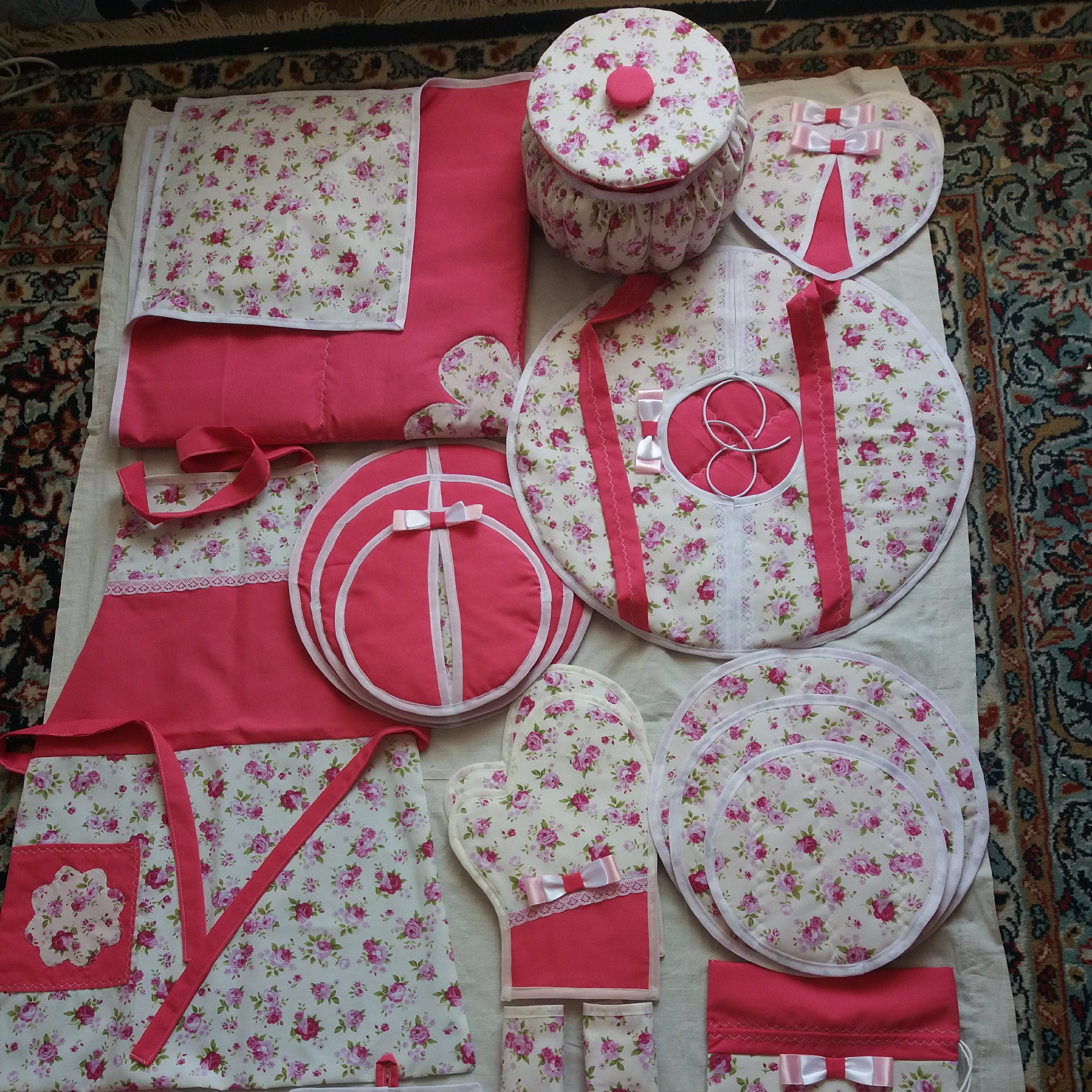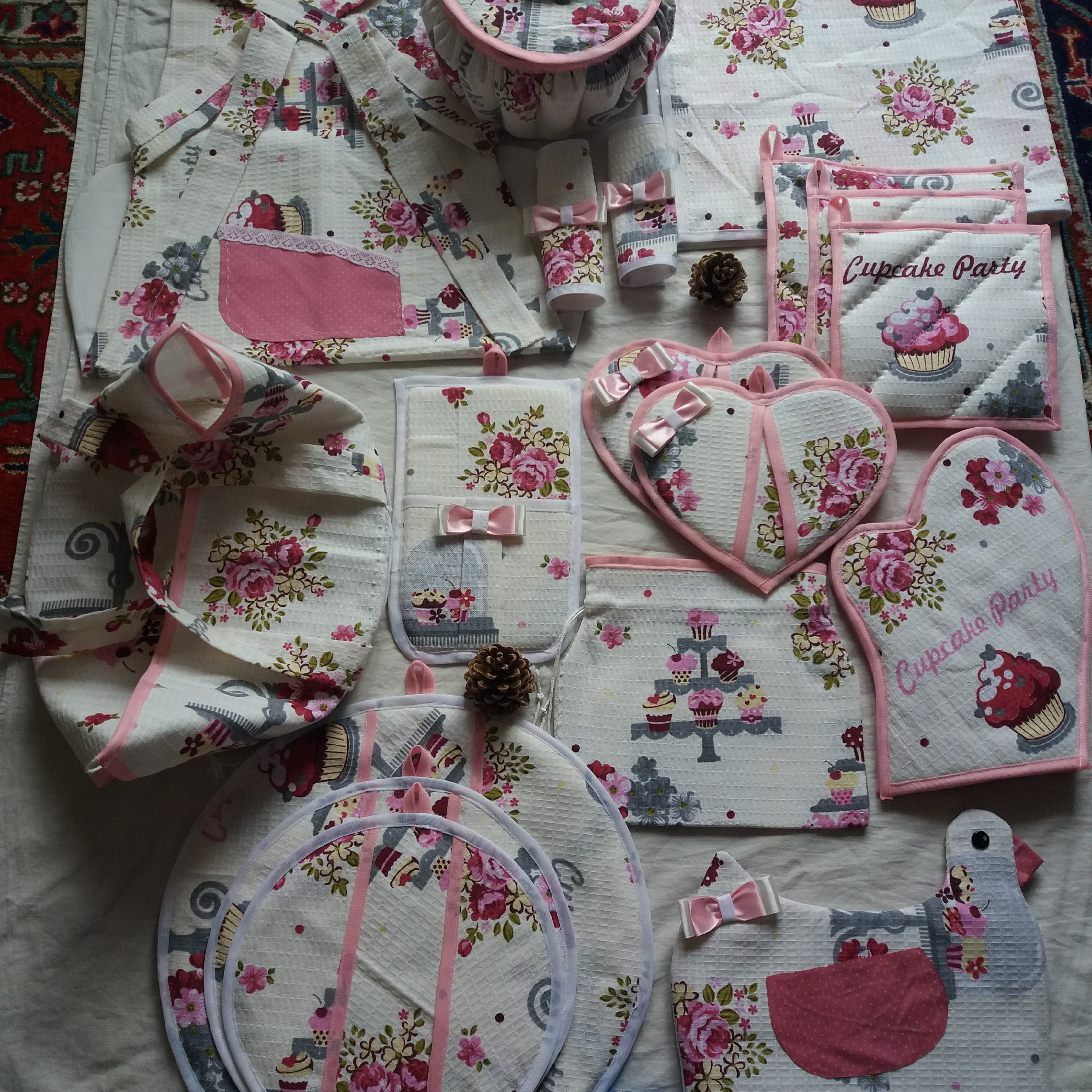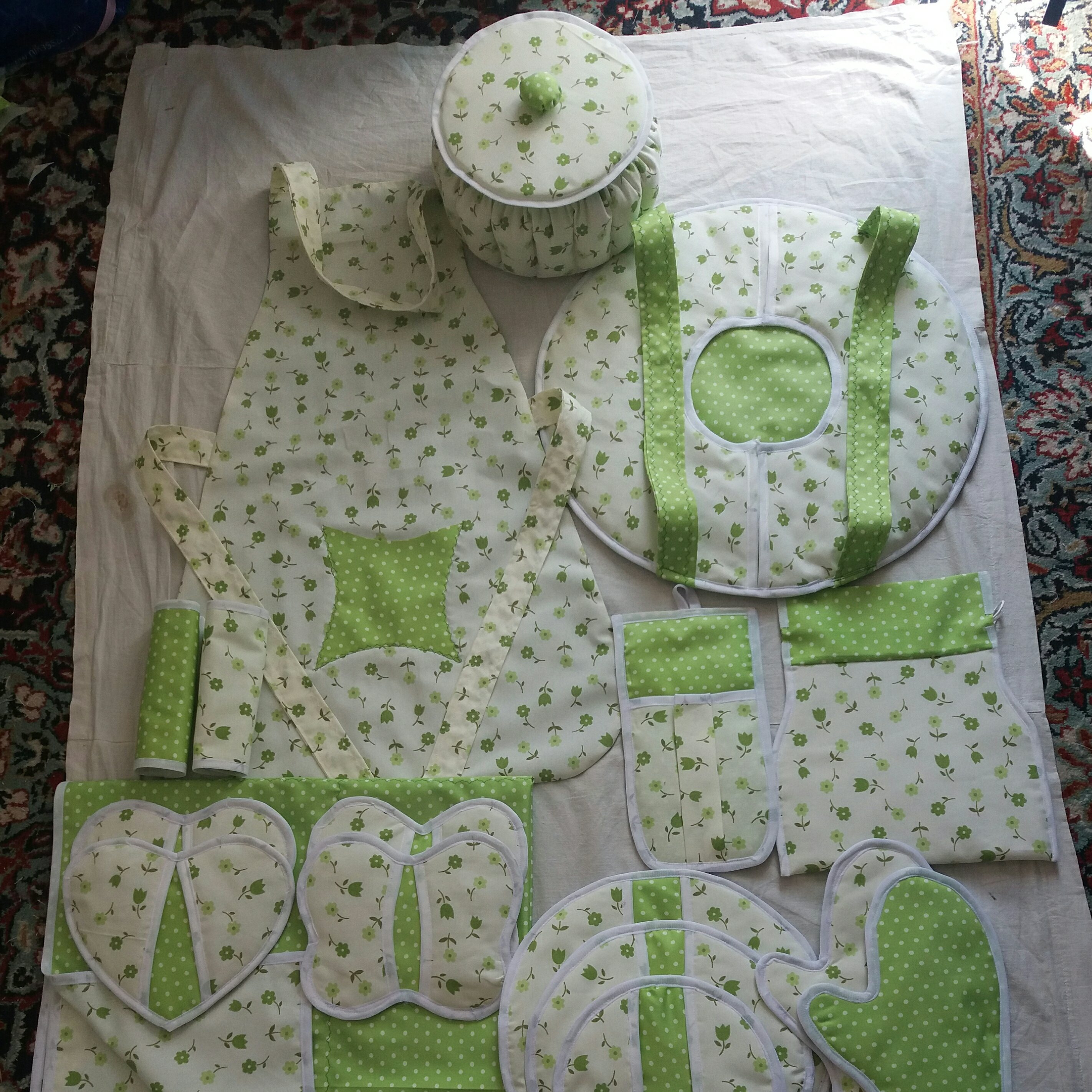 سبد همه کاره، پیشبند، دستکش، نمگیر، دستگیره قابلمه، کیسه سبزی میوه، دم کنی قوری، دم کنی قابلمه، کاور قابلمه، دستگیره یخچال و "یک جاکبریتی به عنوان اشانتیون" تمامی تکه هایی که برای استفاده در آشپزخانه لازم است.
