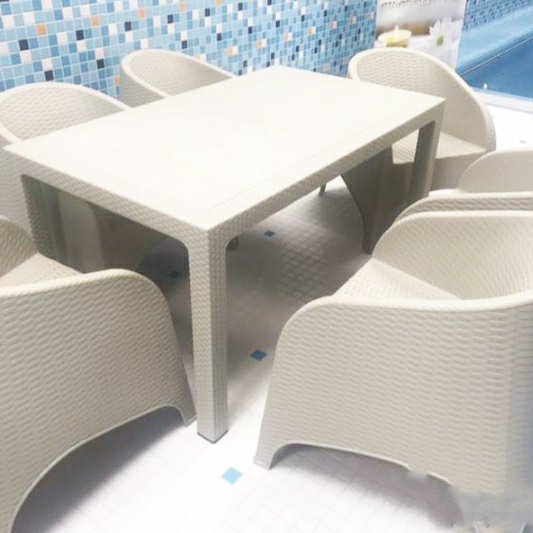اجناس کاملا ضد آب هستند و مقاوم در آفتاب جنوب کشور . طرح حصیری . جنس فایبرگلاس . ابعاد میز 90 در 150 سانت و ابعاد هر صندلی 75 در 75 سانت . دارای رنگ بندی در صورت درخواست مشتریهای عزیز با پرداخت هزینه تشک هم به صندلی ها اضافه میگردد . میز در بسته بندی و قابل مونتاژ میباشد . صندلی ها روی هم سوار شده تحمل وزن هر صندلی 140 کیلوگرم . میز و صندلی شش نفره ناهارخوری ، مخصوص فضای باز، تراس،باغ،استخر،حیاط،