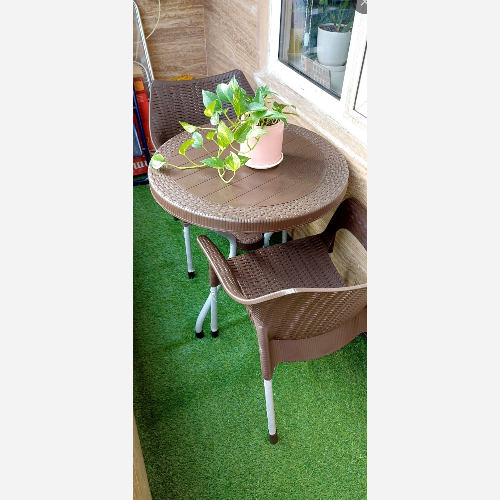 میز و صندلی پلاستیکی 2 نفره با صندلی دسته دار پایه فلزی - مخصوص فضای باز - حیاط - تراس - بالکن-روف - دکور- ارسال رایگان مبلمونسرا مدل 217688