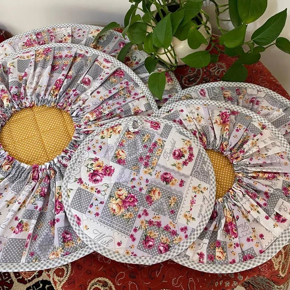 دوخت ست دم کنی ساده مدل کش دار جنس پارچه گل دار تترون نخ درجه یک جنس پارچه خال دار زرد کتان نخ بین کار از پشم شیشه استفاده شده سایز ۲۴و۲۸و۳۲و۴۶و۵۲