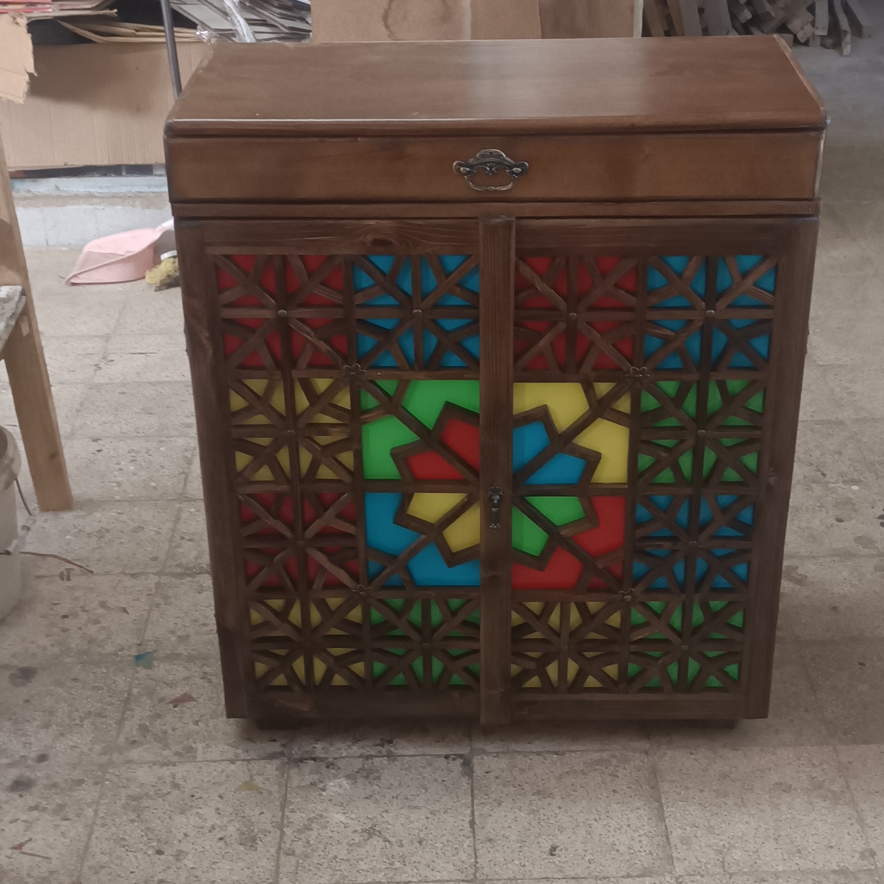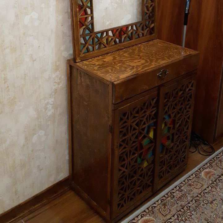 جا کفشی سنتی گره چینی تزیین شده با طلق رنگی و گل میخ سنتی کیفیت عالی دارای چهار عدد طبقه