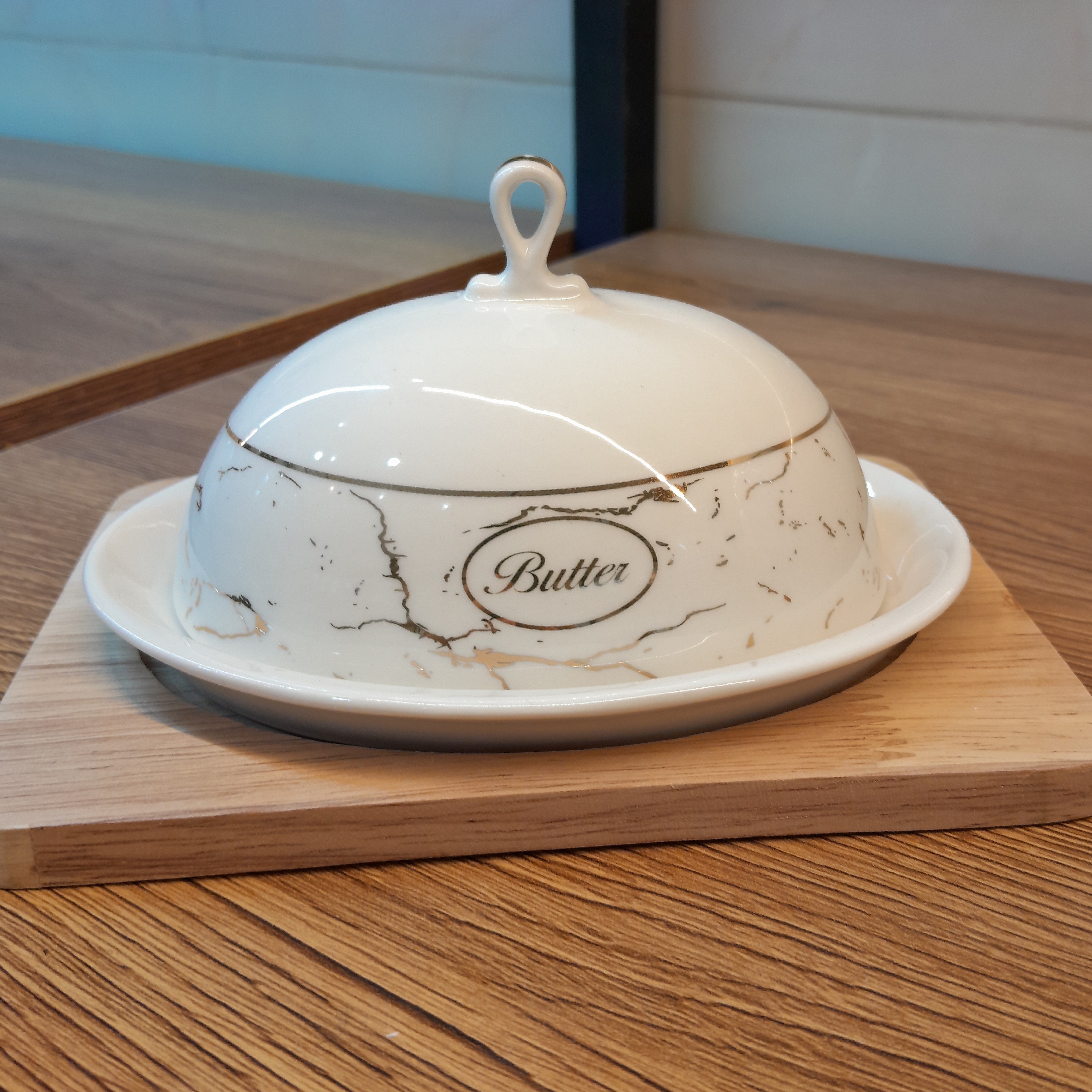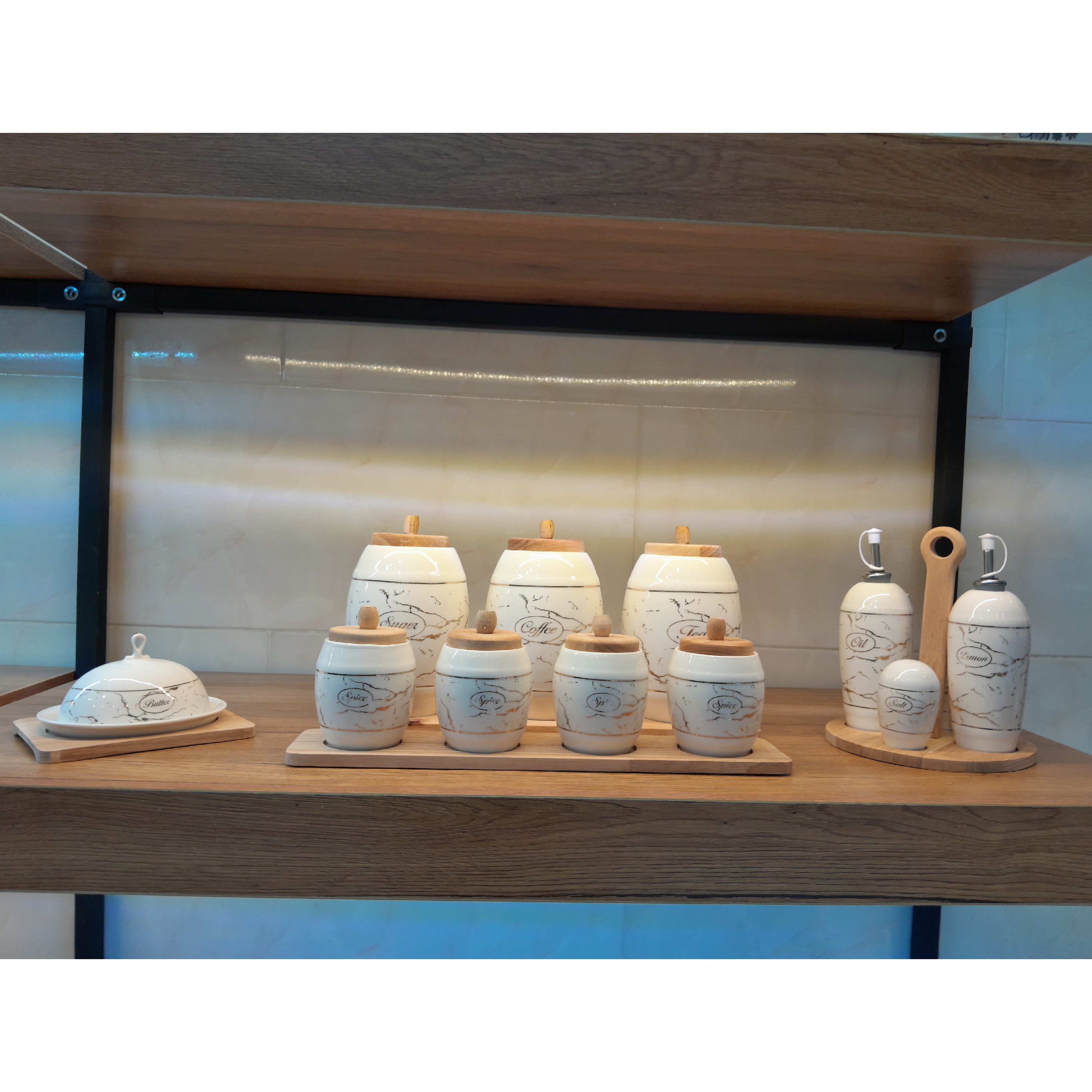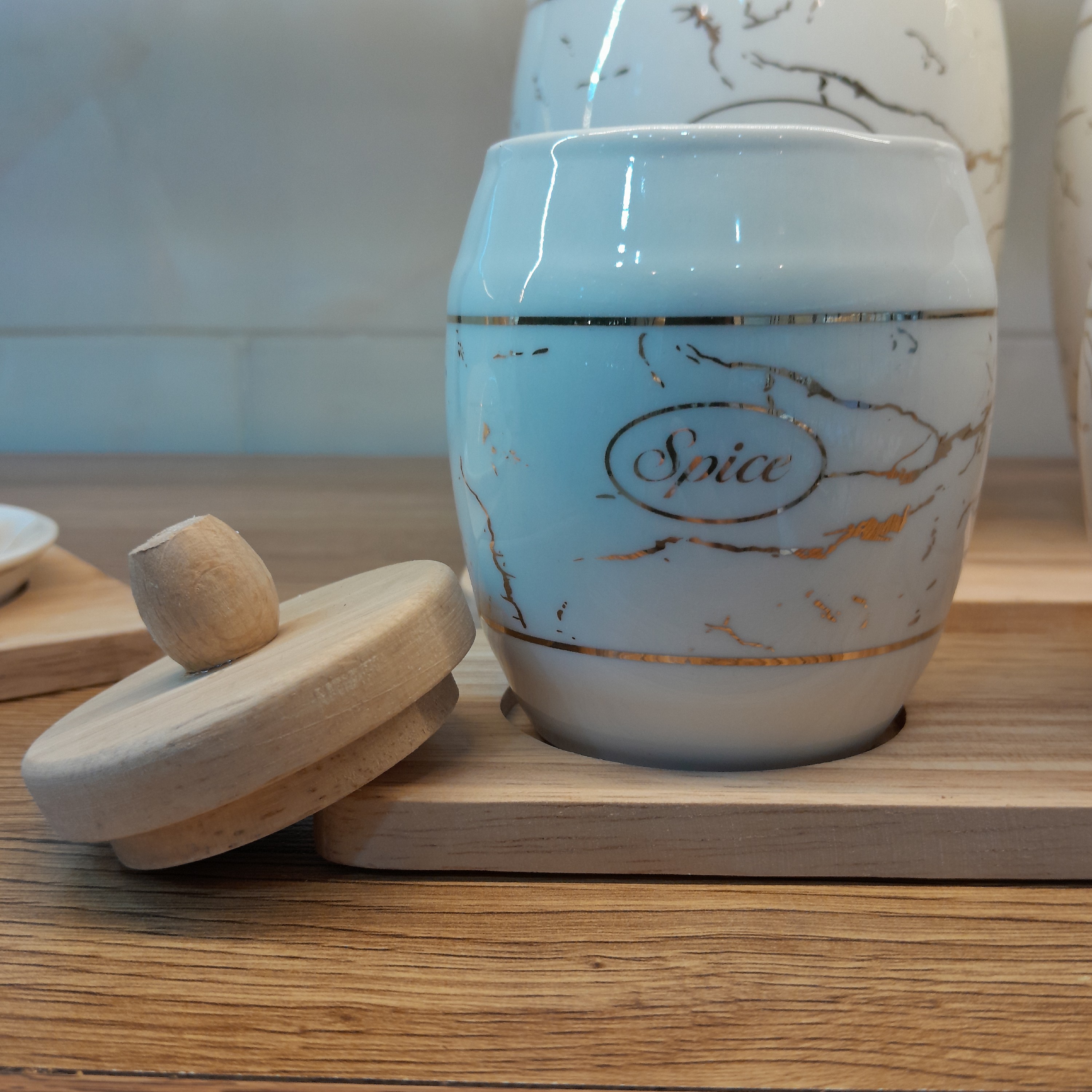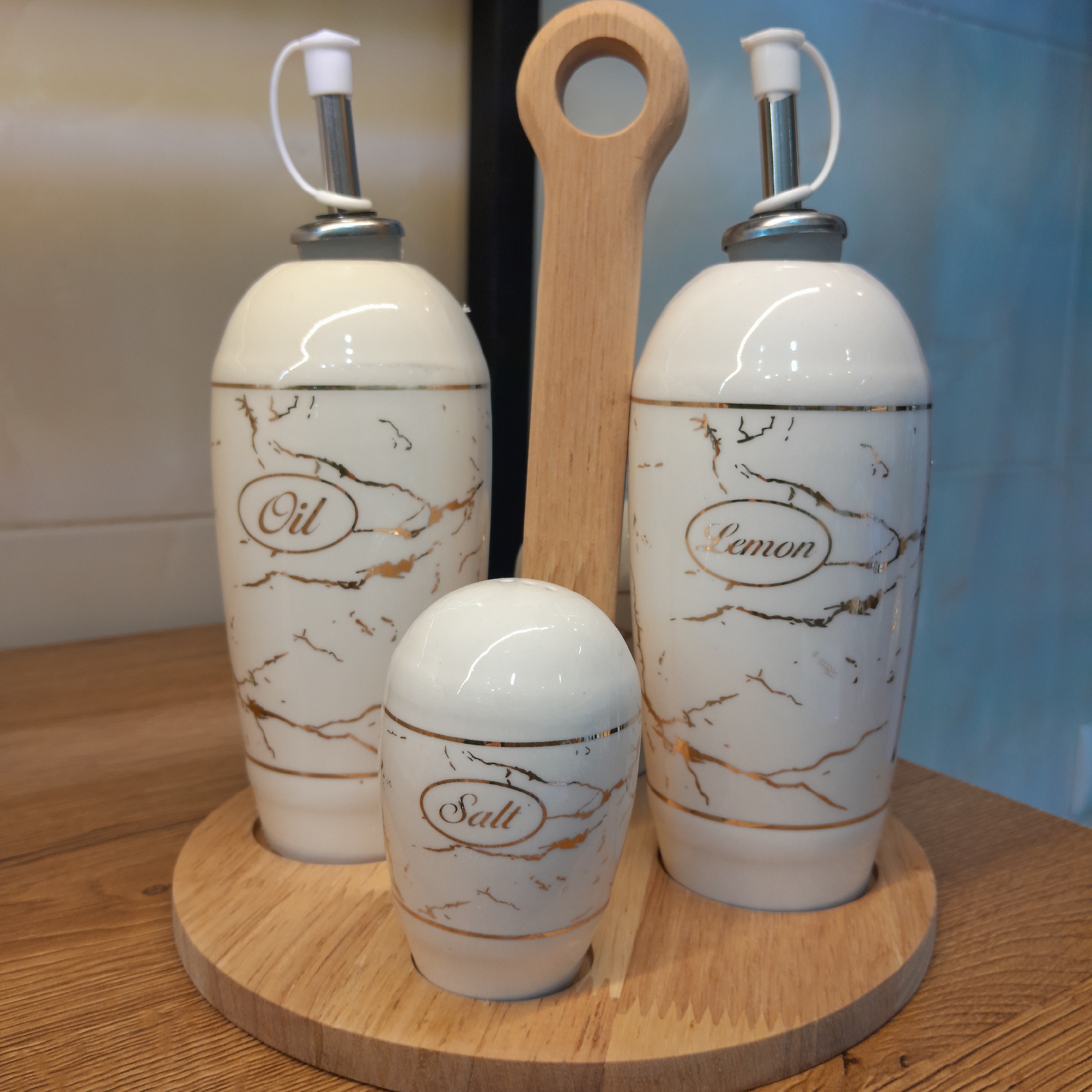 سرویس گرد روکابا کیفیت بسیار عالی چینی کاغذی و چوب رابروود در طرح ماربل آب طلا با بسته بندی یونولیتی شامل : ست بانکه و ادویه ، ست آبلیموخوری و نمکدان ، کره خوری همراه با استند چوبی