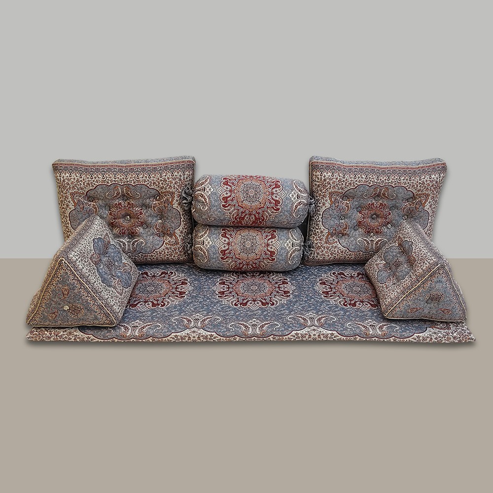سرویس شاهنشین ست 7تیکه پشتی ترمه سنتی دستدوز یزد طرح ترنج رنگ طوسی فیلی گردویی شکلاتی آترمه یزد مبلمونسرا مدل 211256