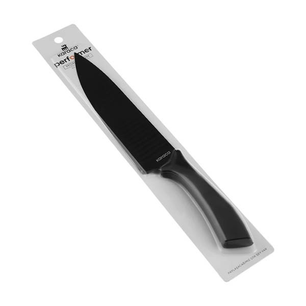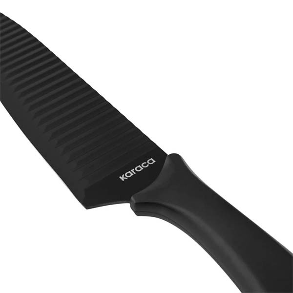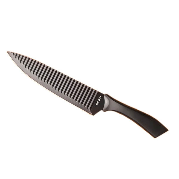 چاقوی حرفه ای مدل سرآشپز کاراجا طرح MOMENTUM با تیغه غیر صاف و موجی شکل ؛ با رنگ ضدخش سیاه و هماهنگ با دسته مشکی ، بسیار خوش دست ، مخصوص آشپزخانه های شیک کدبانوهای مشکل پسند