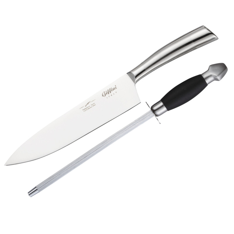 طراحی منحصر بفرد و دارای تعادل استثنایی در کارکردن -تیغه فولادی با شناسه ۳cr۱۴ اصل -ساخت شرکت GIFFINI ایتالیا -استفاده برای گوشت و سبزی و روزمره -دارای دسته براق و طراحی جدید -بسیار تیز و برنده -دارای استاندارد اتحادیه اروپا -تیز شده بوسیله لیزر -سایز بزرگ به طول ۳۳ سانتیمتر و تیزکن به طول ۳۱ سانتیمتر -چاقو مخصوص سرآشپز -چاقو تیزکن بسیار با کیفیت