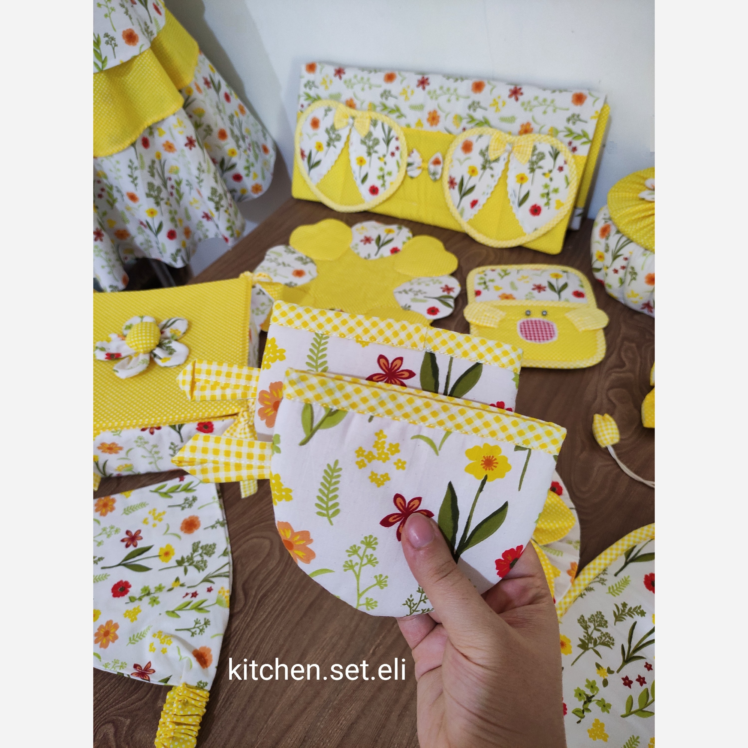 سرویس آشپزخانه عروس با بهترین پارچه ها ومتریال درجه یک تماما دوخته شده به سلیقه مشتری این سرویس شامل ،پیشبند آستین فرشته سه دامنه کلوش ضدآب ،دمکنی شش پر،زیرقابلمه ای قلبی،سبدنون درب دار،نمگیرظروف ضد آب ،دستگیره قلبی، باکس گرد خیاطی ،کیسه سبزی،کاورقابلمه،دستمال سریالچک،کلاه آشپزی ،دستگیره چدن،حوله پیراهنی،دستگیره یخچال،سفره پاک کن طرح حیوانات