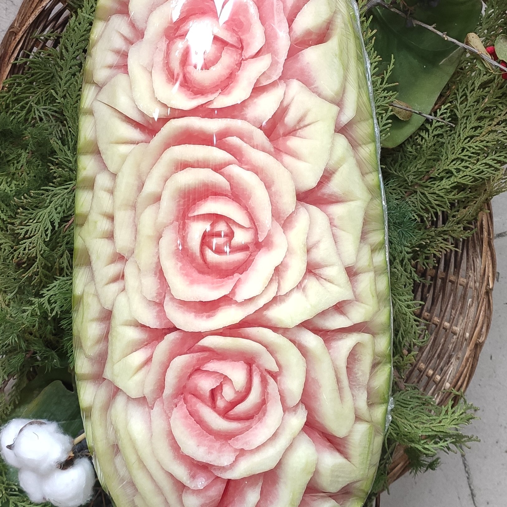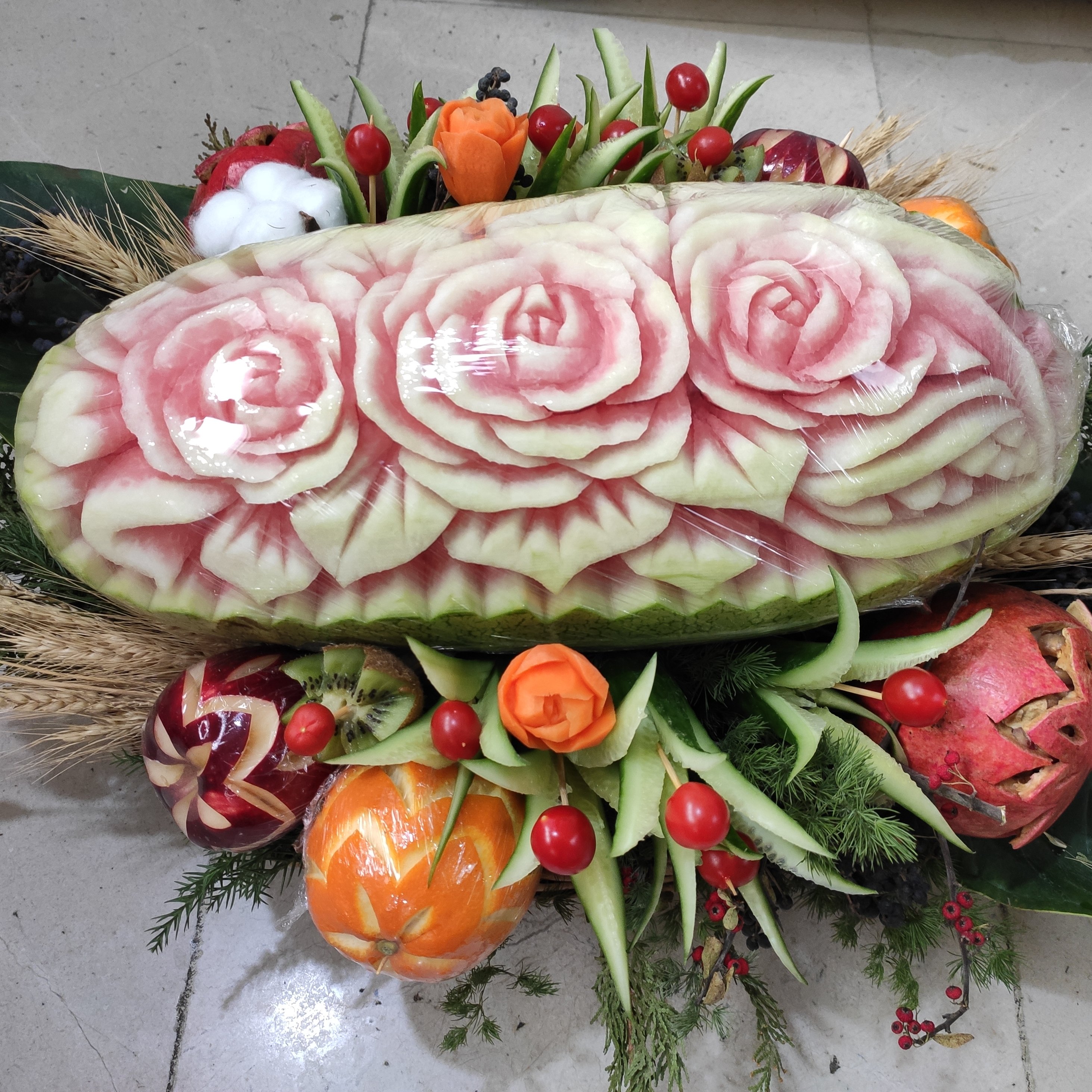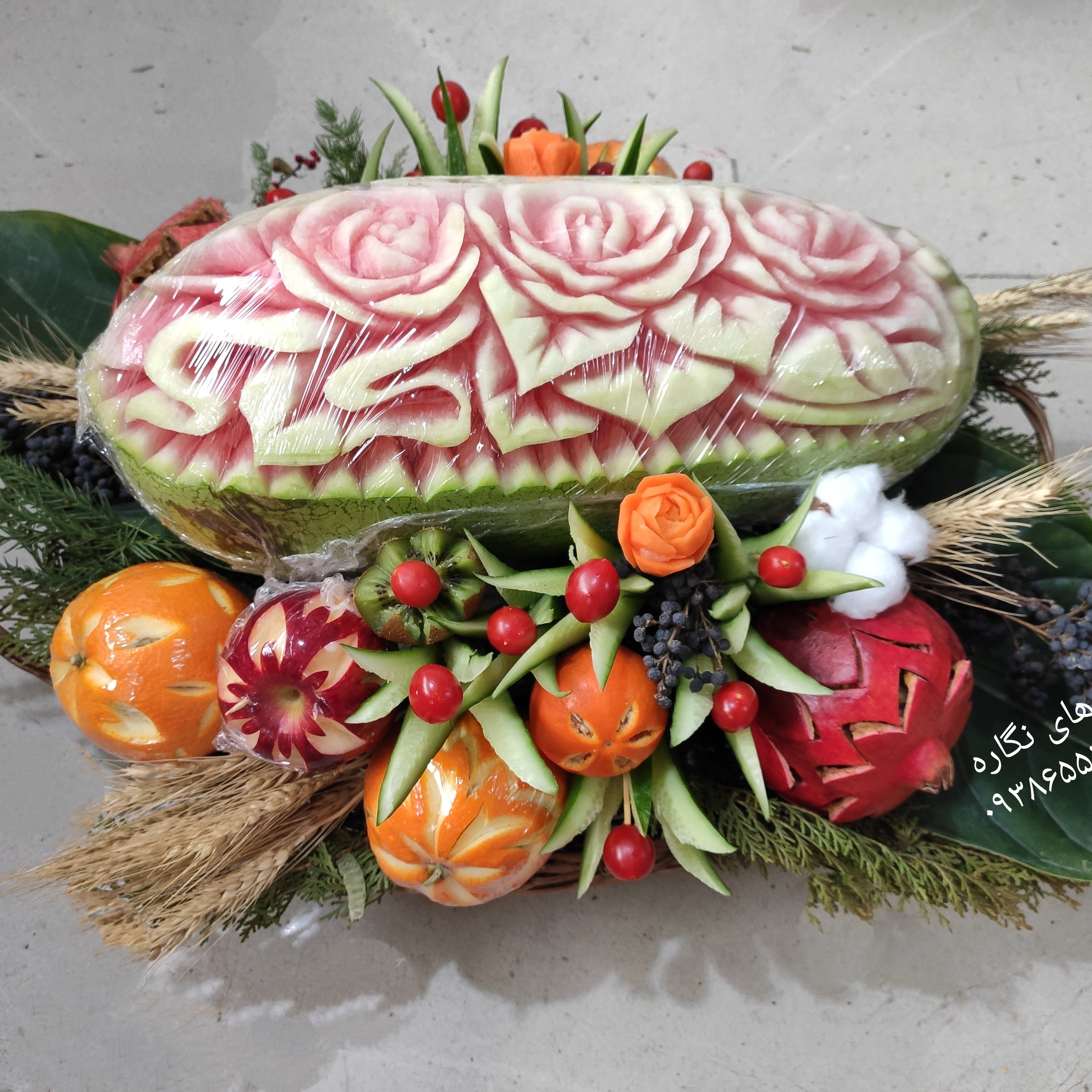 هندوانه بزرگ تزیین شده در سبد حصیری، به همراه میوه های کوچک حکاکی شده،وزن هندوانه حدودا 7_8کیلو است.تزیین شده با گلهای هویج و ....