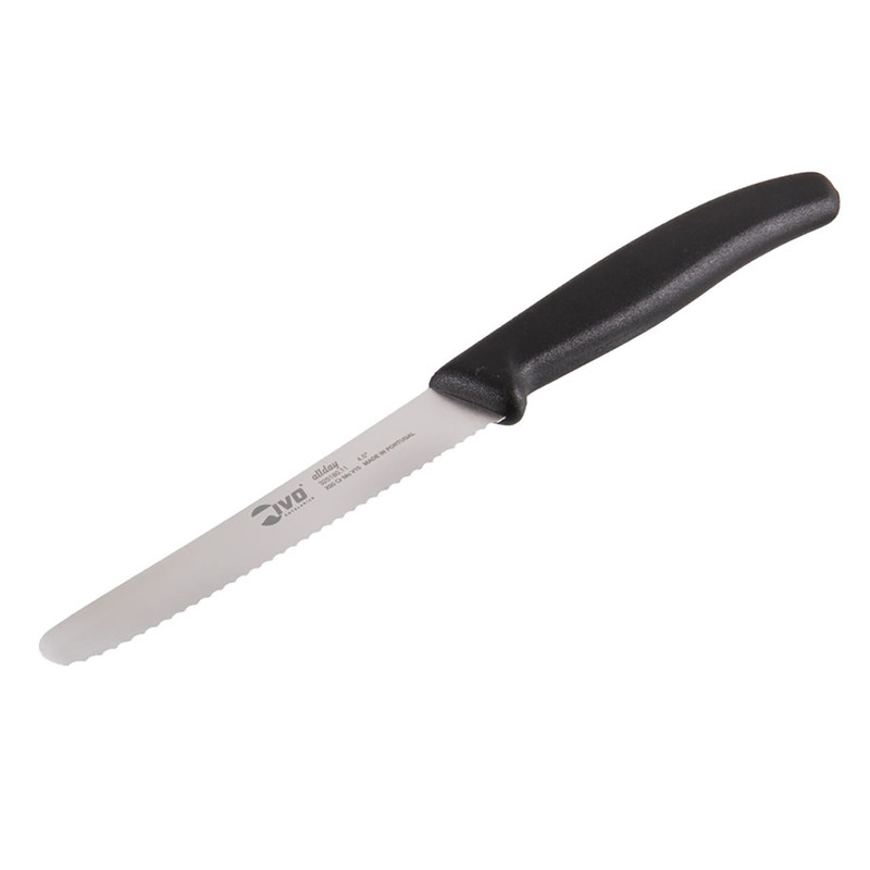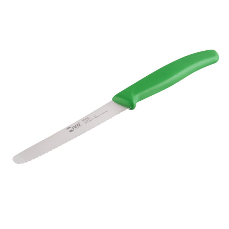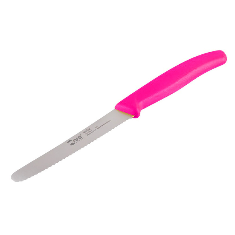 اقوی All Day از محصولات بسیار پرطرفدار برند پرتغالی IVO می باشد که از محبوبیت بسیاری برخوردار است. این چاقو از نوع چاقوهای معروف به Paring یا اصطلاحا چاقوی پوست گیری و خرد کنی دم دستی در آشپزخانه است که ابزار دست شما در آشپزخانه خواهد بود. تیغه اره ای بسیار برنده و به طول حدود 11 سانتی متر و از جنس فولاد ضد زنگ با میزان کربن بالا و بسیار م دارد. عرض تیغه آن در پهن ترین قسمت به 1.8 سانتی متر می رسد و تیغه آن شیبی ملایم و یکنواخت دارد و بسیار برنده می باشد. دسته این محصول حدود 10 سانتی متر طول و 2 سانتی متر عرض دارد و از جنس پلاستیک م استخوانی ساخته شده و جنسی زبر دارد که باعث چسبندگی به دست و گریپ بسیار راحت می شود. طول کل چاقو 21 سانتی متر است و دارای غلافی پلاستیکی برای محافظت از تیغه می باشد.برای شستشوی این چاقو می توان از ماشین و دست استفاده کرد.