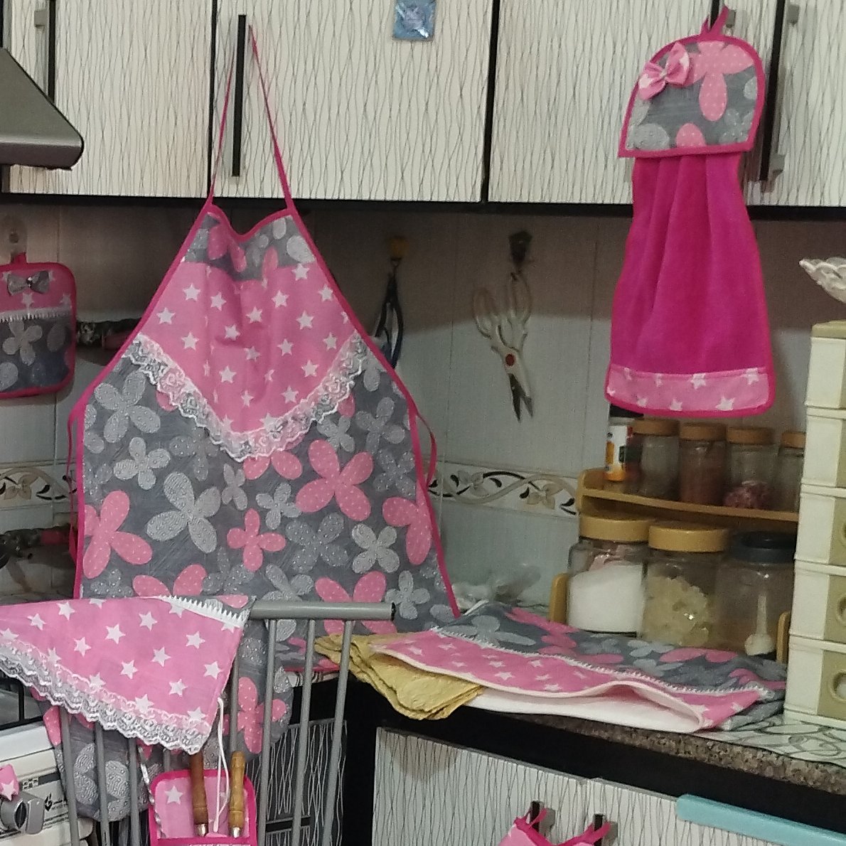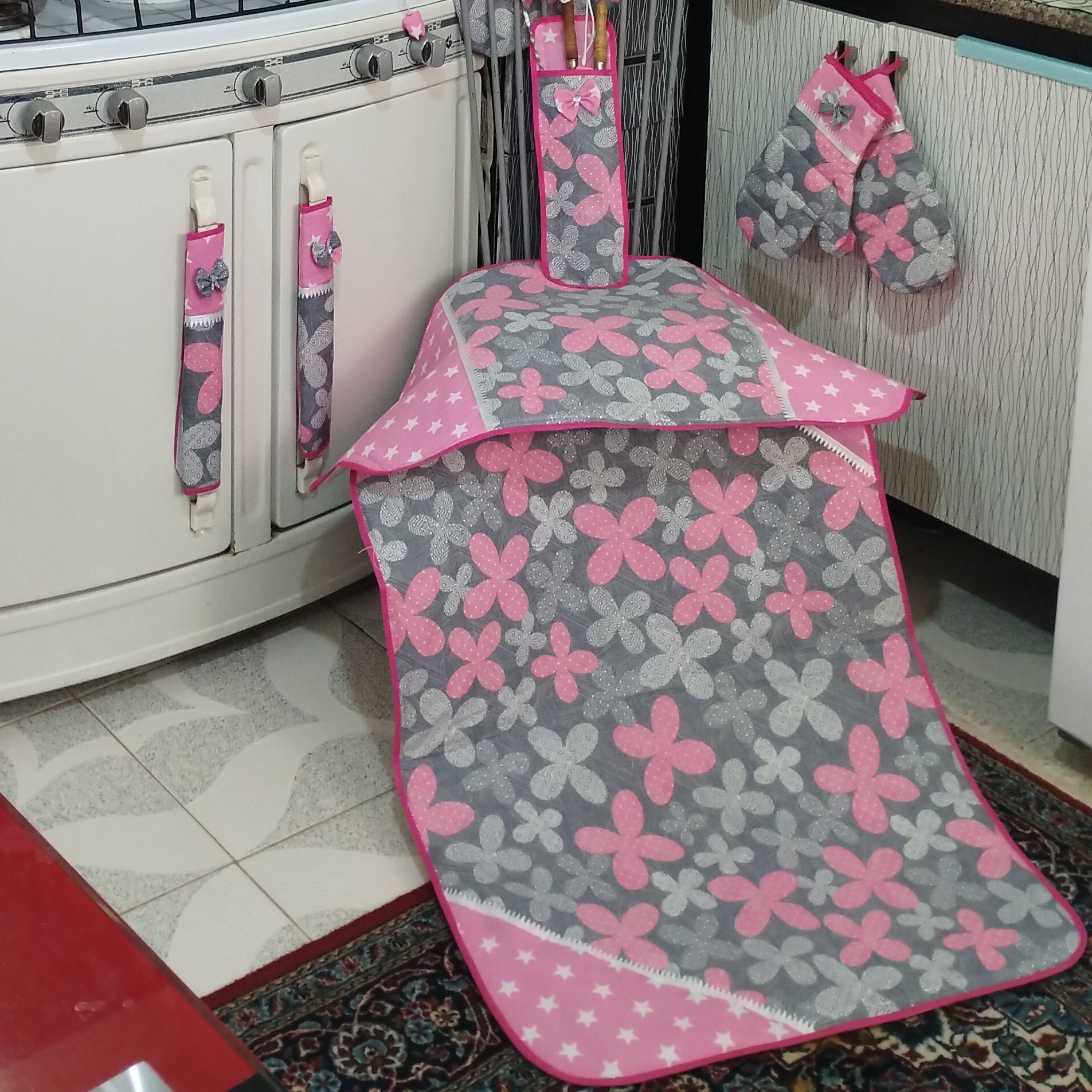 سرویس آشپزخانه پارچه ای ۲۰ تیکه شامل : حوله ساده پیش بند ساده سایز ۶۰ در ۷۵ دستکش فر نمگیر کوچک مستطیلی در سایز ۵۰ در ۱۰۰ نمگیر بزرگ مستطیلی در سایز ۷۰ در ۱۰۰ یک جفت دستگیره یخچال با ارتفاع ۳۵ دمی چهار پر ۳ جفت دستگیره کیسه نان سایز ۷۰ در ۱۰۰ کیسه سبزی سایز ۴۰ در ۳۰ جا سیخ کباب کیف با پارچه تترون اعلا سفارش دوخت سرویس آشپزخانه با طرح و رنگ و جنس دلخواه شما پذیرفته می شود
