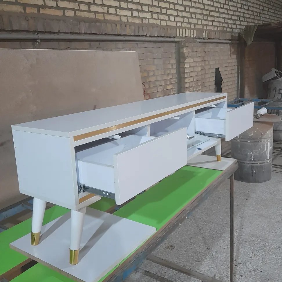 میزتلوزیون کد120باپایه های چوبی جنس کارام دی اف درب وسط جای دستگاه داشبوردی هست با۲عدد کشوهای کناری وریل ساچمه ای ۳زمانه
