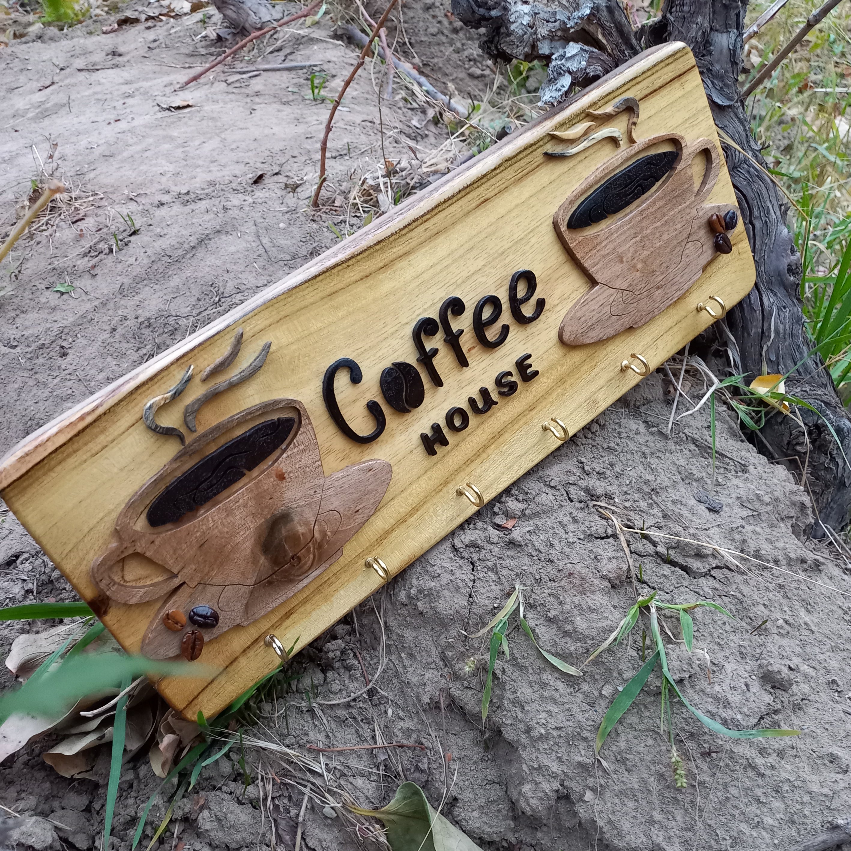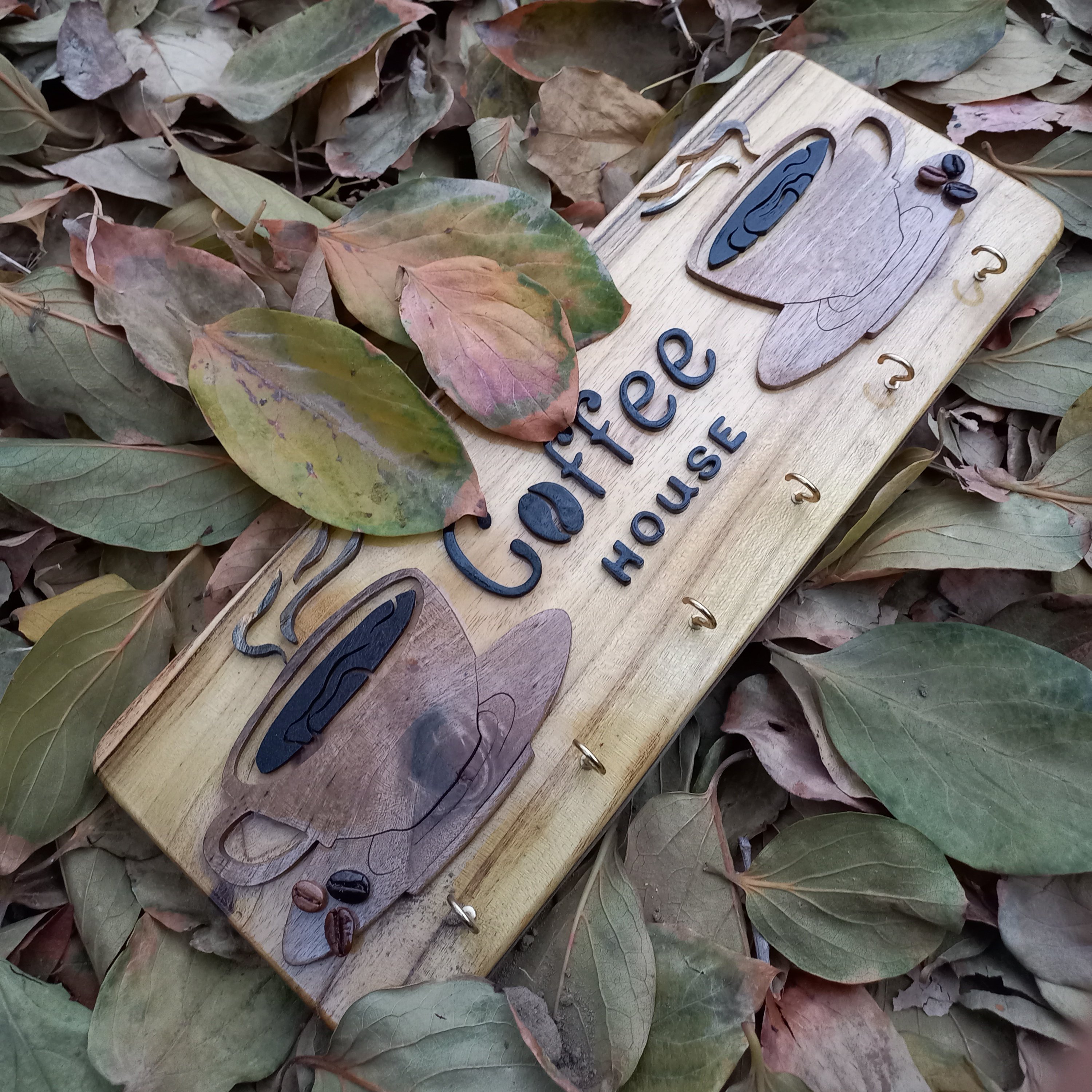 آویز فنجان قهوه و چای،زیر کار mdfخام و بعد چوب اقاقیا سبز چسباندم،چوبی که فنجون رو درست کردن افرای خاکستریه و کلمه قهوه هم چوب گردو سوخته
