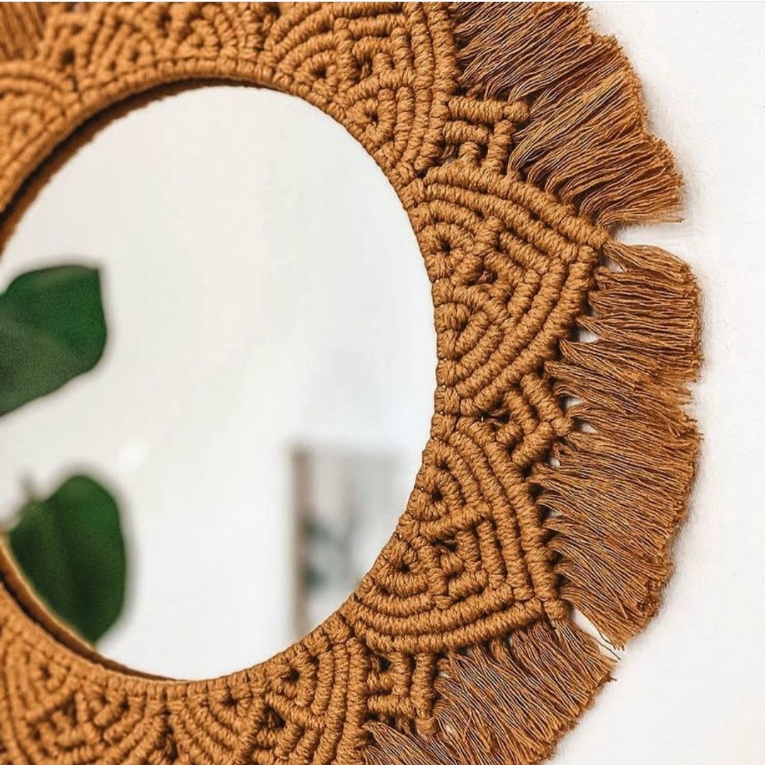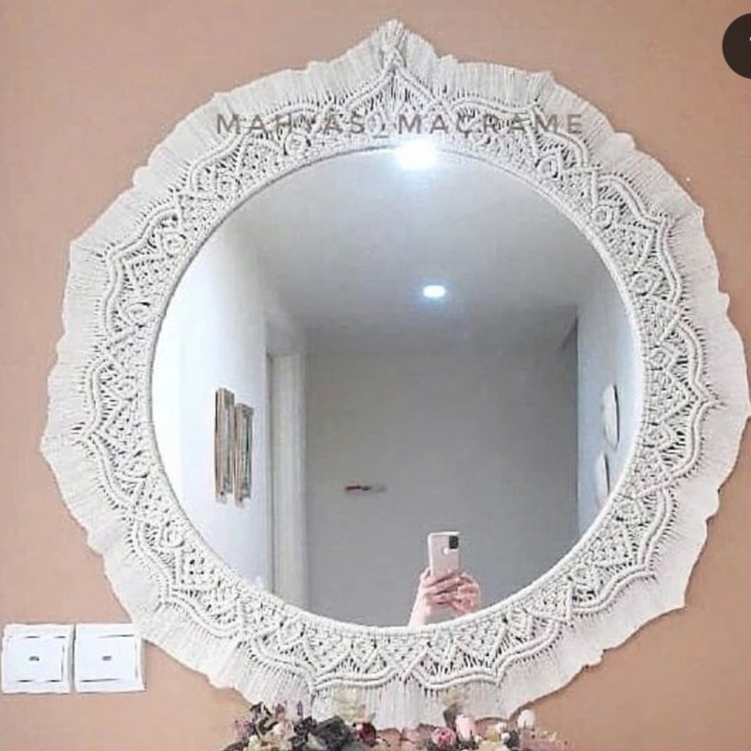 آینه مکرومه در هر سایزی قابل اجراست رنگبندی متنوع و مطابق با سلیقه مشتری قیمت برای آینه با قطر ۳۰ و بافت حاشیه قطر نهایی 60 می باشد