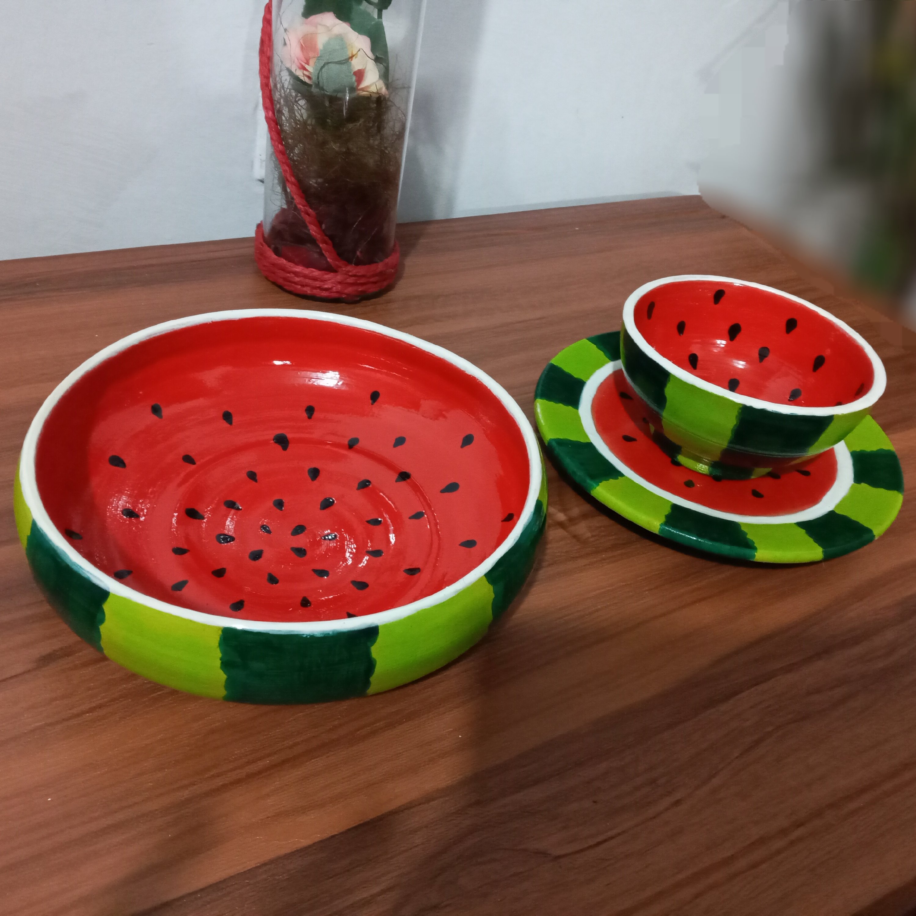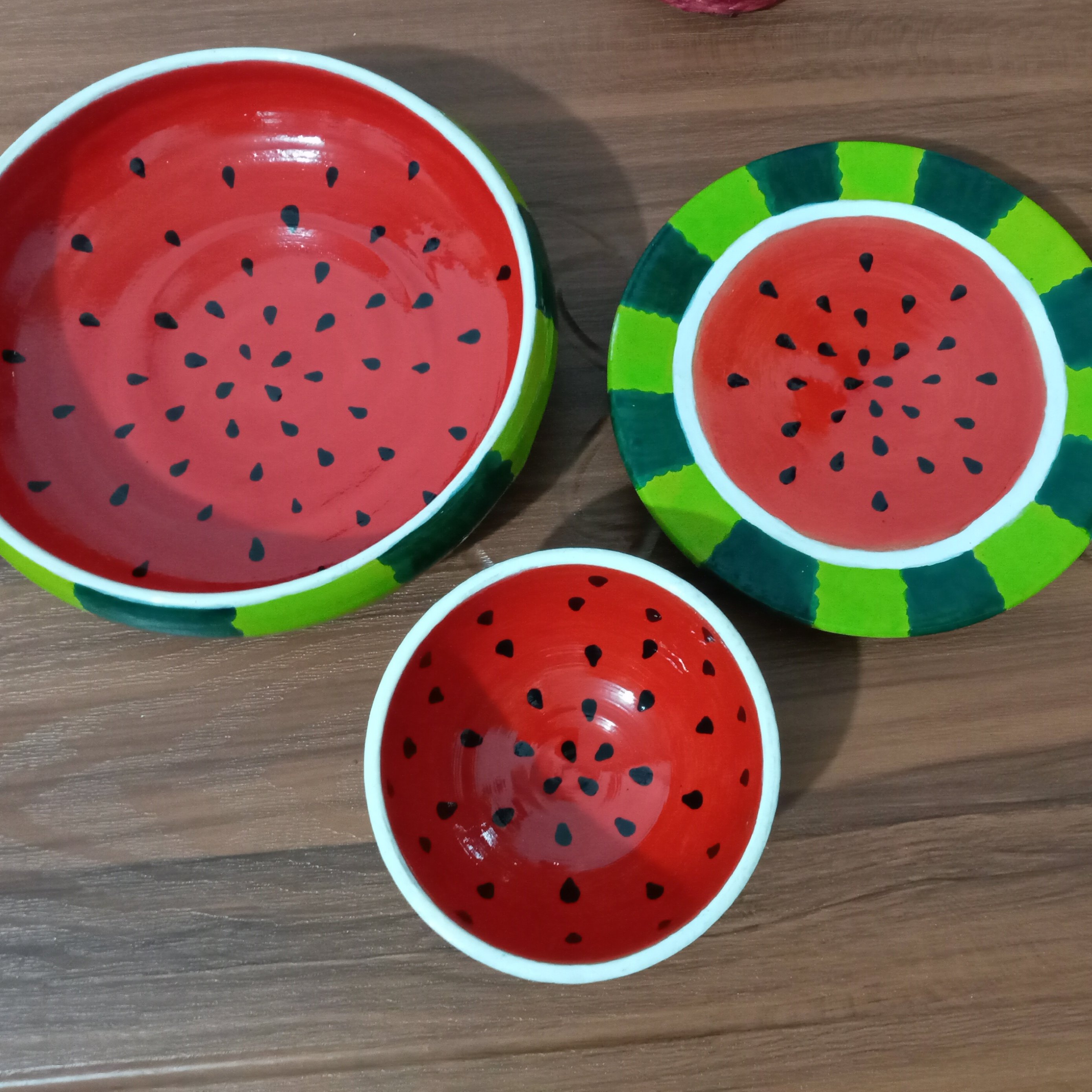 ست سه تیکه یلدایی از جنس سفال. براق و ضدآب.قابل اجرا در طرح و رنگ دلخواه شما.سایز و تعداد کاسه و بشقاب ها قابل تغییر می باشد.