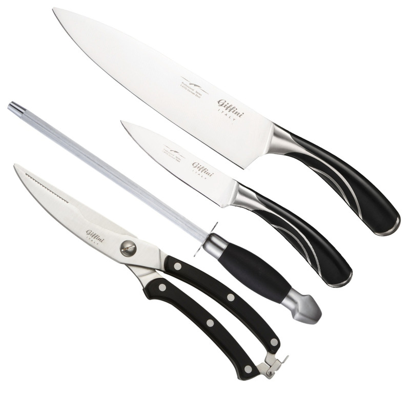 -طراحی منحصر بفرد و دارای تعادل استثنایی در کارکردن -تیغه فولادی وانادیوم -ساخت شرکت GIFFINI ایتالیا -استفاده برای گوشت و سبزی و روزمره -دارای دسته و تیغه یکسره -بسیار تیز و برنده -دارای استاندارد اتحادیه اروپا -تیز شده بوسیله لیزر -مناسب استفاده روزمره و دم دستی -ضریب تیزی ۱۴ (بسیار تیز) ۱ عدد تیزکن-۱ عدد قیچی اشپزخانه و نان- سایز کوچک:۲۴*۳*۲ - سایز بزرگ :۳۲*۴.۵*۲