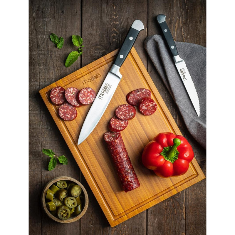 ست 5 پارچه چاقوی آشپزخانه مدل BLAZE از جمله محصولات بسیار پرکاربرد و با کیفیت فوق العاده برند موسیو است که می تواند نیاز شما را به انواع چاقو در آشپزخانه و به هنگام آشپزی برآورده کند. این ست شامل 5 عدد چاقو در سایز و فرم تیغه مختلف است که هر یک متناسب با نیاز مورد استفاده قرار می گیرند. تیغه این چاقو ها به شکل یکپارچه و تا انتهای دسته ریخته گری شده است و جنس آن از نوعی استیل با فرمولاسوین خاص و کربن بالا تهیه شده که در عین ضد زنگ بودن و مقاومت بالا بسیار تیز و برنده بوده و به راحتی امکان پوست گیری، خرد و قطعه قطعه کردن انواع مواد غذایی را فراهم می کند. نوع طراحی دسته در این چاقوها دارای فرمی بسیار زیبا و کلاسیک بوده و جنسی سینتاتیک دارد و در واقع از ترکیبی از مواد بسیار مقاوم و در عین حال با کیفیت ساخته شده است که حس چوب را به هنگام در دست گرفته شدن القا می کند. چاقوهای موجود در این ست شامل چاقوی پوست گیری یا Paring، چاقوی اره ای یا Steak، چاقوی برش یا Slicing Knife، چاقوی برش نان و چاقوی سرآشپز یا Chef's Knife می باشند. با داشتن این 5 چاقو شما قادر به انجام کلیه امور آشپزی بوده و برای سالیان طولانی از کیفیت بالای این ابزار بهره مند خواهید بود. در صورت تمایل به داشتن استند می توانید مدل Mission از همین سری چاقو را تهیه بفرمایید که همراه یک استند چوبی و تخته برش عرضه می گردد.