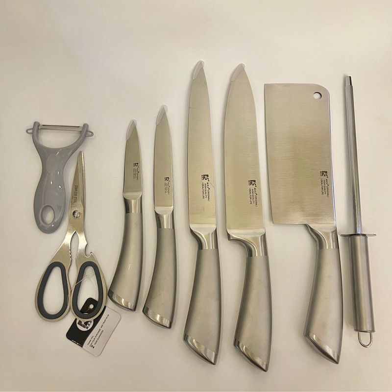 سرویس شامل ۴عدد کارد در سایزهای مختلف میباشد.دارای ۱عدد ساطور،۱ عدد قیچی آشپزخانه،۱عدد پوست کن،۱عدد چاقو تیز کن و ۱عدد استند است.جنس کارد از استیل بوده و ضدزنگ میباشد.