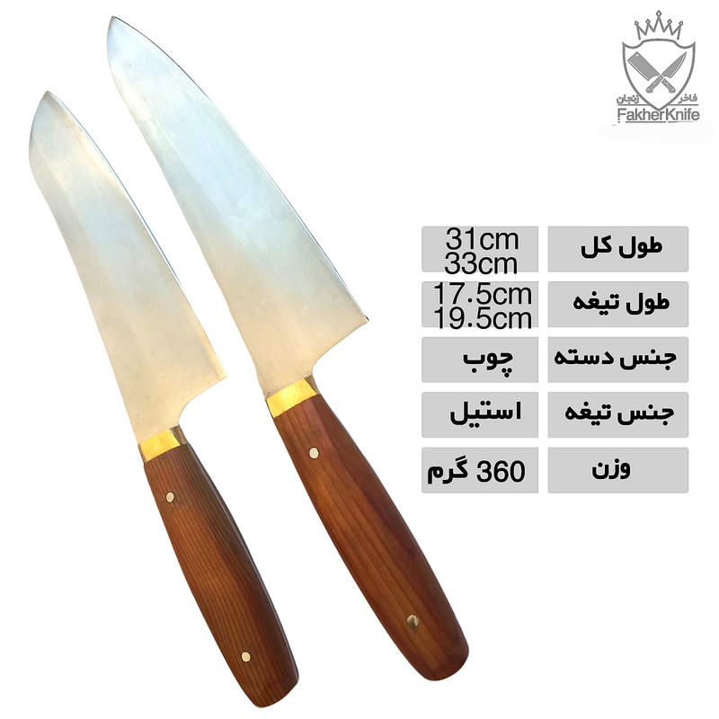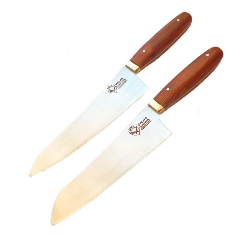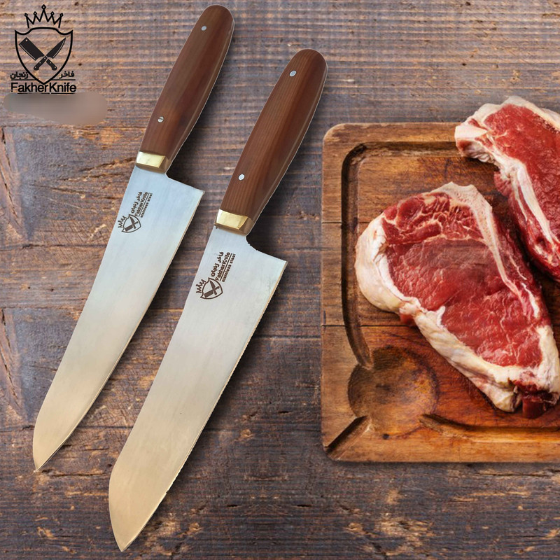 این ست دو پارچه با الگو برداری از چاقوی های ژاپنی دارای زیبایی خاص و منحصر به فردی می باشد این ست بسیار تیز و پر کاربرد می باشد و دارای دو چاقوی پر کاربرد آشپزخانه می باشد چاقوی بزرگ به چاقوی سرآشپز شهرت دارد که برای برش سبزیجات و گوشت استفاده دارد و چاقوی کوچک به چاقوی راسته شهرت دارد که برای خرد کردن مرغ و تکه کردن کوشت و ریز ریز کردن ان استفاده دارد جنس تیغه این محصول از استیل می باشدکه سیاه نمیشودجنس دسته این محصول از چوب مرغوب و با کیفیت ترمو وودمی باشدو دربرابرآب کیفیت ثابتی دارد