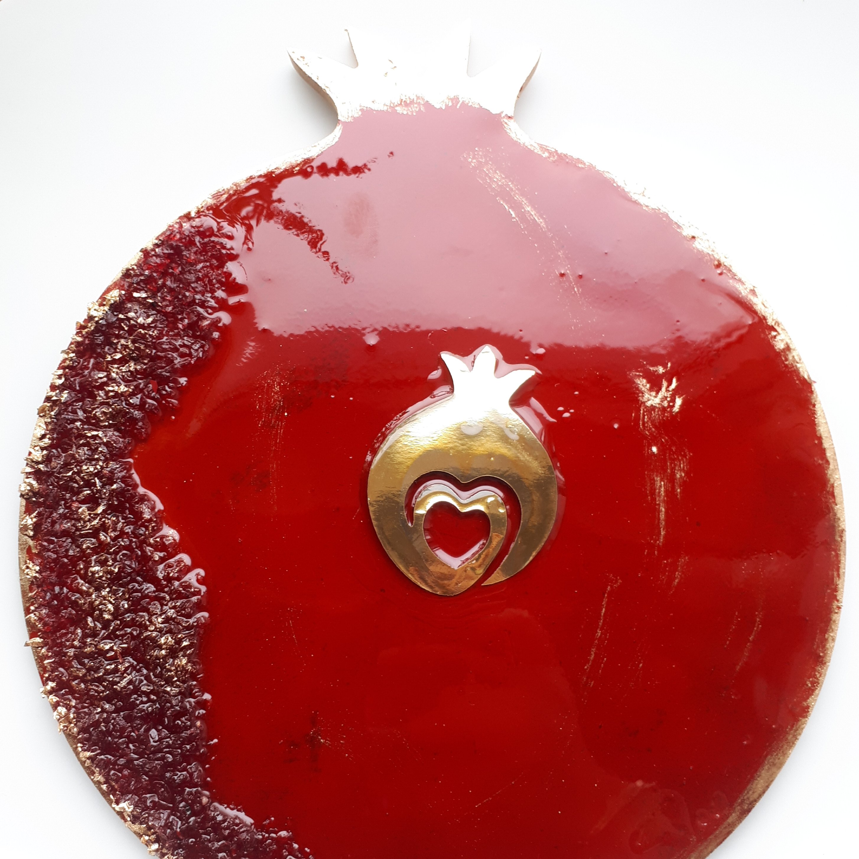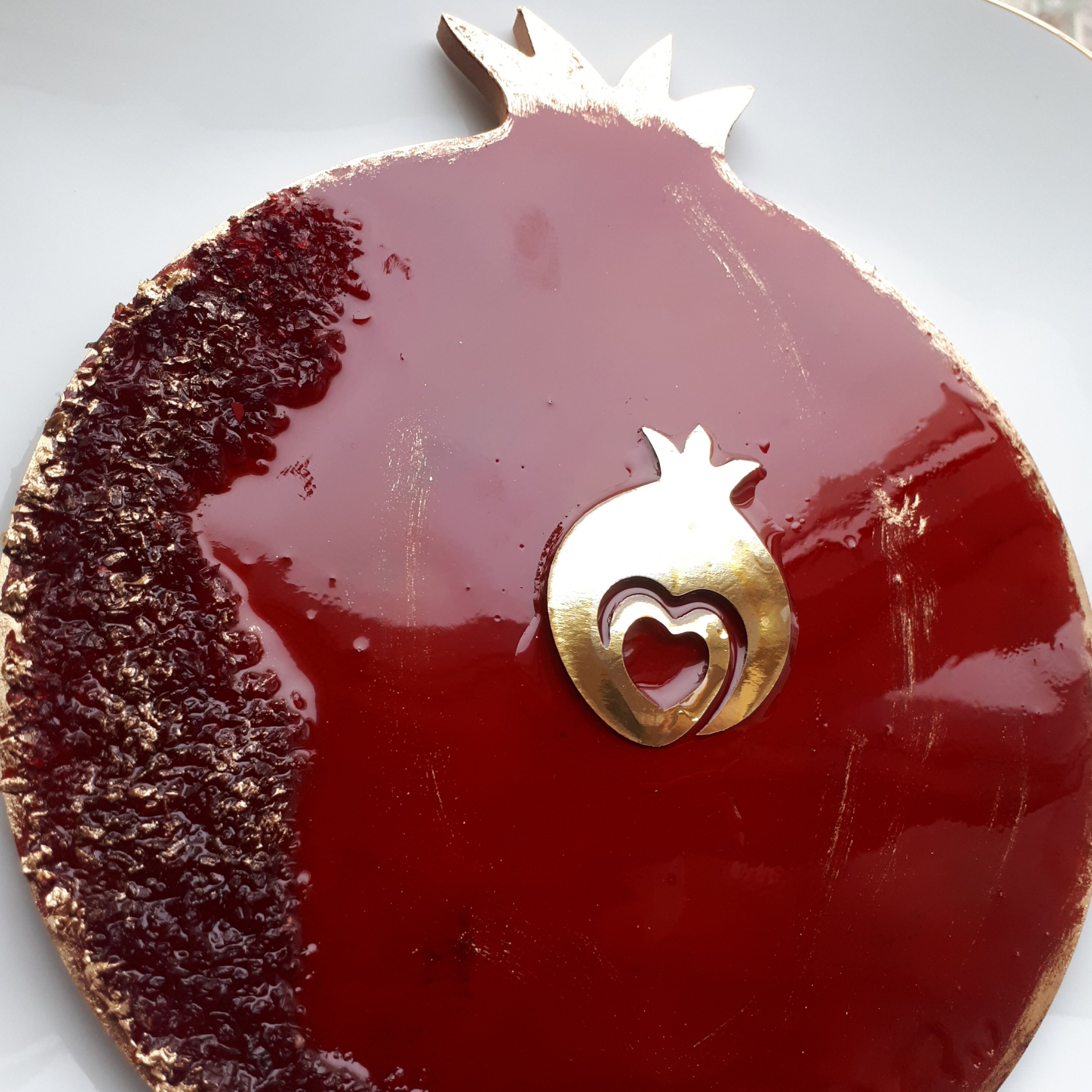 سینی یا استند انار جنس رزین بیس چوبی مناسب برای میوه چای شیرینی مناسب برای شب یلدا رنگ سرخ اناری ابعاد ۲۵سانت قابل سفارش
