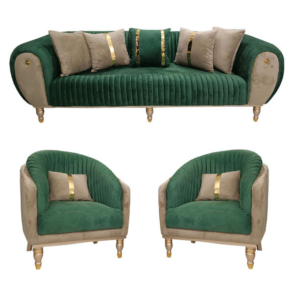 مبلمان این طرح 5 نفره است و شامل 1 عدد کاناپه 3 نفره و 2 عدد صندلی 1 نفره می باشد. در این مبلمان از نخ 6 لا کامپیوتری استفاده شده که تمیز و با دقت بالا هست که همین باعث دوچندان شده زیبایی این مبلمان شده است در اسکلت این کار از چوب روس استفاده شده که از استحکام بالایی برخوردار هست و این چوب قابلیت رنگ پذیری بسیار بالایی دارد و در برابر حشرات چوبخوار بسیار مقاوم هستد. رنگ چوب این مبل از رنگ پلی یورتان فرانسوی استفاده می شود که بسیار با کیفیت است. در نشیمن این مبل راحتی از فوم سرد یورولوکس استفاده شده که بسیار راحت است و علاوه بر آن، شکل ظاهری خودش را حفظ می کند و همین طور طول عمر طولانی تری را نسبت به فوم گرم و اسفنج به دنبال دارد و به همین دلیل چندین سال به خرید مبل جدید احتیاج پیدا نخواهید کرد. مبل بصورت دو رنگ ارسال میشود و رنگ کوسن ها بصورت ست با رنگ انتخابی شما توسط فروشنده ارسال میشود. در تمام عکس ها ترکیب رنگ مشخص شده است ومبلمان بر اساس ترکیب رنگی که انتخاب شده است ارسال میشود