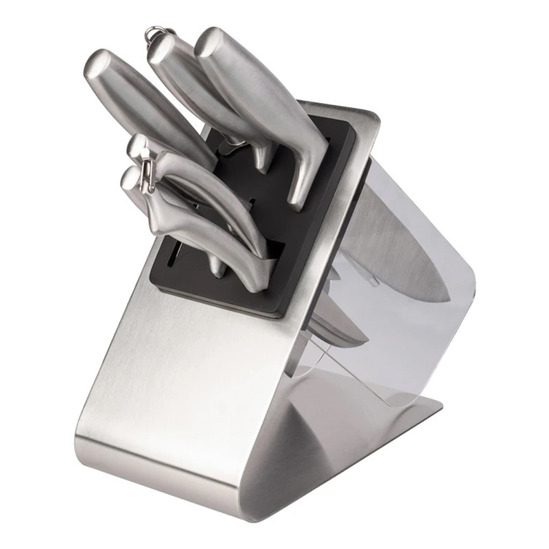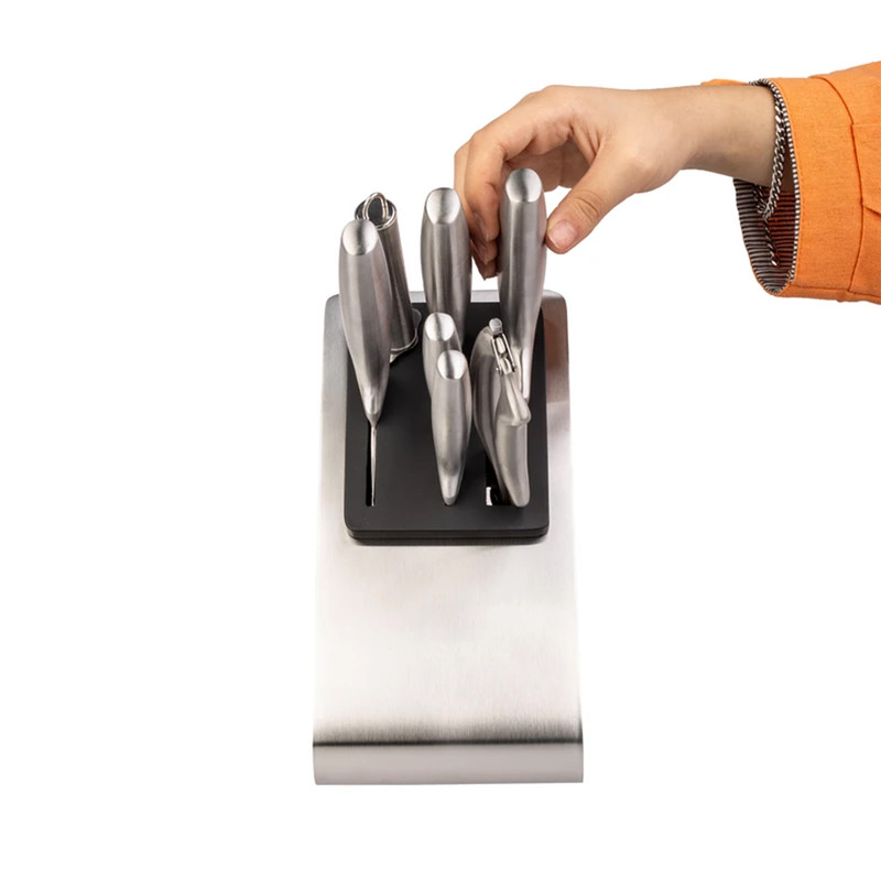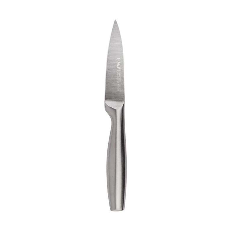 سرویس چاقو 8 پارچه جی ام زد دارای دسته نومیک - تیغه آلمانی - جنس تیغه استیل ضد زنگ می باشد و قابلیت قرار دادن در ماشین ظرفشویی رادارد.این سرویس شامل : ساطور به طول ۱۷ سانتیمتر - چاقو برش گوشت به طول ۲۰ سانتیمتر - چاقو برش نان به طول ۲۰ سانتیمتر - چاقو برش میوه به طول ۱۱.۵ سانتیمتر - چاقو برش میوه به طول ۸.۵ سانتیمتر - چاقو تیز کن به طول ۳۰ سانتیمتر - قیچی به طول ۲۶ سانتیمتر و دارای قفل - استند به ابعاد ۲۵×۱۲×۲۴ سانتیمتر و وزن ۹۷۰ گرم