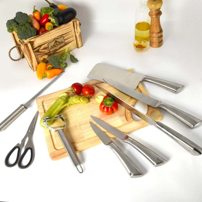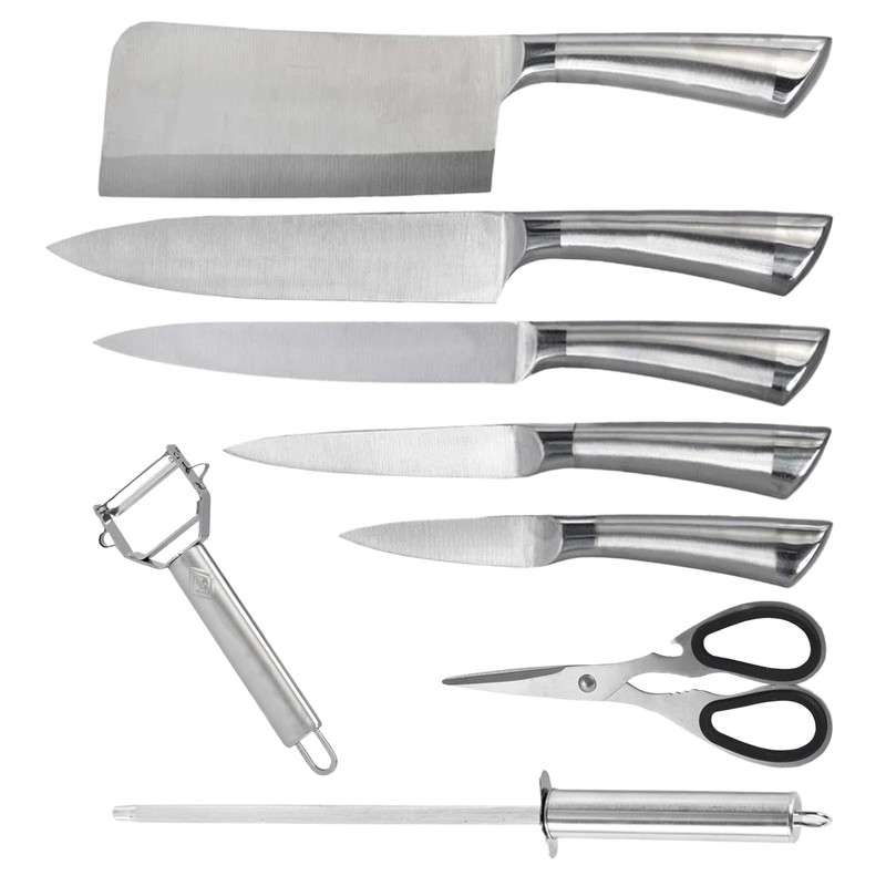 این سرویس کارد 8 پارچه یکی از مدل های بسیار زیبا و در عین حال پر کاربرد در آشپزخانه است که مخاطبان می توانند از هر کدام از ابزارهای آن نهایت استفاده را ببرند. این سرویس چاقو یک پکیج کامل است که اجزای آن شامل کارد دم دستی، کارد گوشت و سبزی، کارد سرآشپز، ساطور حرفه ای، قیچی آشپزخانه یک تکه، پوست کن و چاقو تیز کن می باشد. جنس این محصول از استیل ضد زنگ 18/10 ساخته شده است و بل طراحی دسته و بدنه یک تکه این چاقو، هرگز دسته آن جدا نخواهد شد و شما را سالیان سال از خرید مجددا آن بی نیاز خواهد کرد. وزن مناسب و خوش دست بودن از ویژگی های مثبت دیگر این سرویس کارد می باشد. همچنین اگر بعد از استفادهی مداوم تیغهی چاقوها کُند شد، با تیز کنندهی موجود در این ست، قادر هستید این ابزار را دوباره تیز و بُرنده کنید.