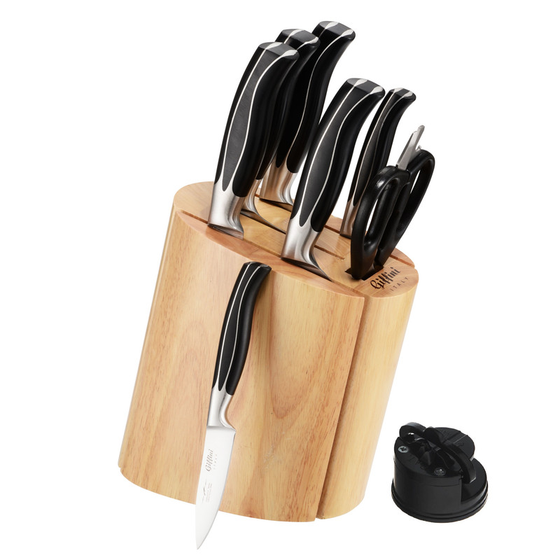-تیز شده توسط لیزر بسیار دقیق -جنس تیغه ها وانادیوم اصل میباشد -دسته و بدنه یک تکه و سرهم میباشد و امکان جدا شدن را هرگز ندارد. - پایه قابل شستشو میباشد. -کاردها ساخت شرکت GIFFINI میباشد شامل :ساطورC;EAVER: طول کلی ۳۲، طول تیغه ۱۹ سانتیمتر - چاقو برش سایز ۱: طول کلی ۱۹.۵، طول تیغه ۸.۲ سانتیمتر - چاقو برش نان: طول کلی ۳۲، طول تیغه ۱۹ سانتیمتر - چاقو برش سایز ۳: طول کلی ۲۳، طول تیغه ۱۱.۵ سانتیمتر - چاقوی سرآشپز: طول کلی ۳۲، طول تیغه ۱۹ سانتیمتر -چاقوی برش سایز ۴:طول کلی۲۸.طول تیغه ۱۹ سانتی متر - -قیچی آشپزخانه: طول کلی ۲۵ سانتی متر -پایه کارد -تیزکن