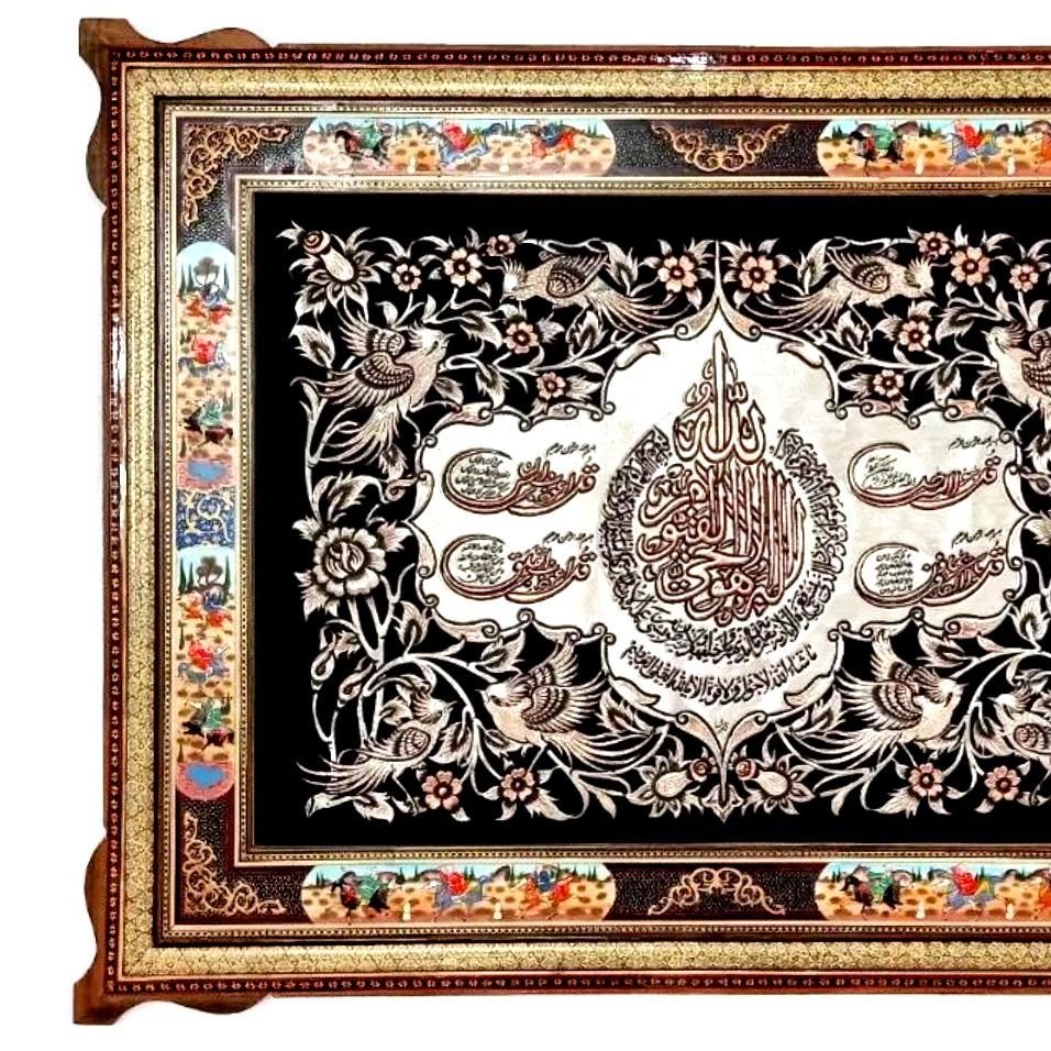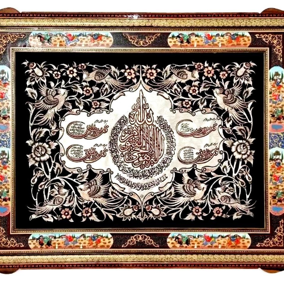 تابلو قلمزنی مسی طرح آیه الکرسی وچهارقل و دور گل و مرغ با قاب خاتم صلیبی با نقاشی گل و مرغ گوشه دار سایز 70در90سنتی متر مبلمونسرا مدل 267775