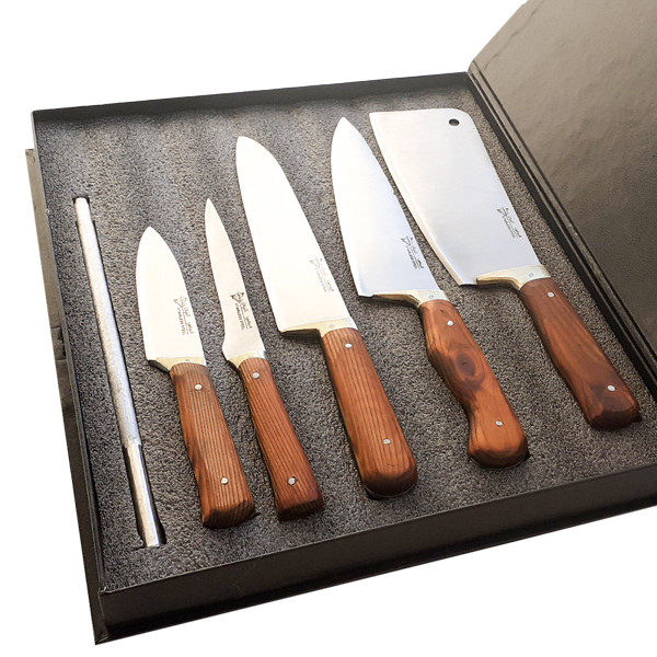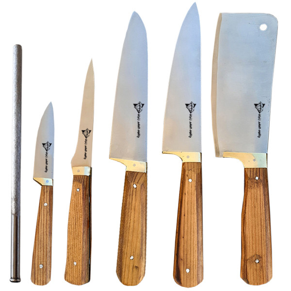 این سرویس که یکی از بهترین و با کیفیت ترین سرویس های موجود چاقو آشپزخانه می باشد شامل: کارد دم دستی/ کارد فیله/کارد راسته/کارد سرآشپز / ساتور و چاقو تیز کن می باشد جنس چاقو ها از استیل زنگ نزن می باشد و جنس مسقل از بهترین آلیاژ فولاد می باشد به نوعی که دارای سختی بالا و م است که به راحتی با چند حرکت چاقو را تیز خواهد کرد این سرویس دارای جعبه چوبی لوکس می باشد