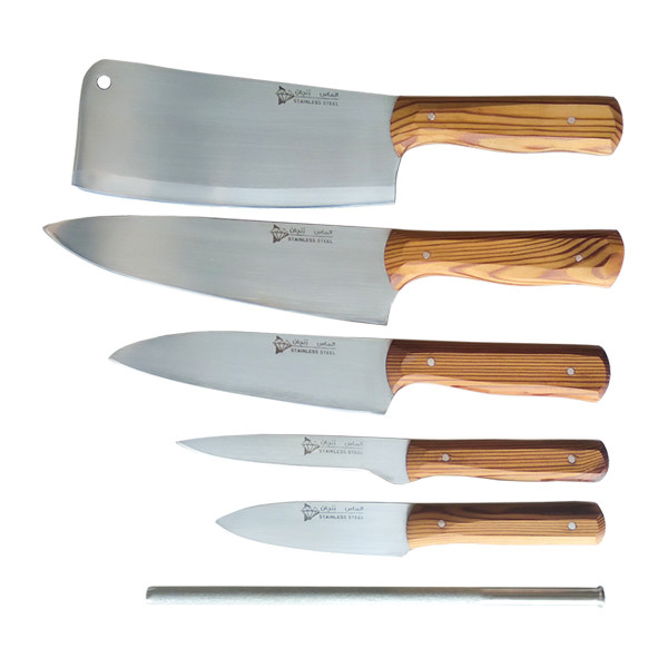 این محصول سرویس 6 پارچه چاقوی آشپزخانه می باشد که جنس تیغه ها از استیل زنگ نرن و جنس دسته ها از چوب ضد آب می باشد این سرویس شامل 6 چاقوی پرکاربرد آشپزخانه می باشد: کارد فیله: مخصوص فیله کردن انواع گوشت کارد دم دستی: مخصوص خرد کردن و برش های سبک مثل پوست کندن انواع میوه، سیب زمینی و پیاز کارد راسته مخصوص برش گوشت کارد سرآشپز مخصوص برش های حرفه ای و سریع ساطور خانگی: مخصوص خرد کردن سبزیجات و گوشت مسقل: مخصوص تیز کردن انواع چاقو، قیچی و لبه تیز بسیار برنده و قابلیت تیز کردن آسان در منزل (جنس مصقل فولادی می باشد) این محصول قابلیت کادویی و جهیزیه را دارد و در آشپزخانه کارایی فوق العاده ای را دارد محصول دارای جعبه مقوایی لوکس می باشد