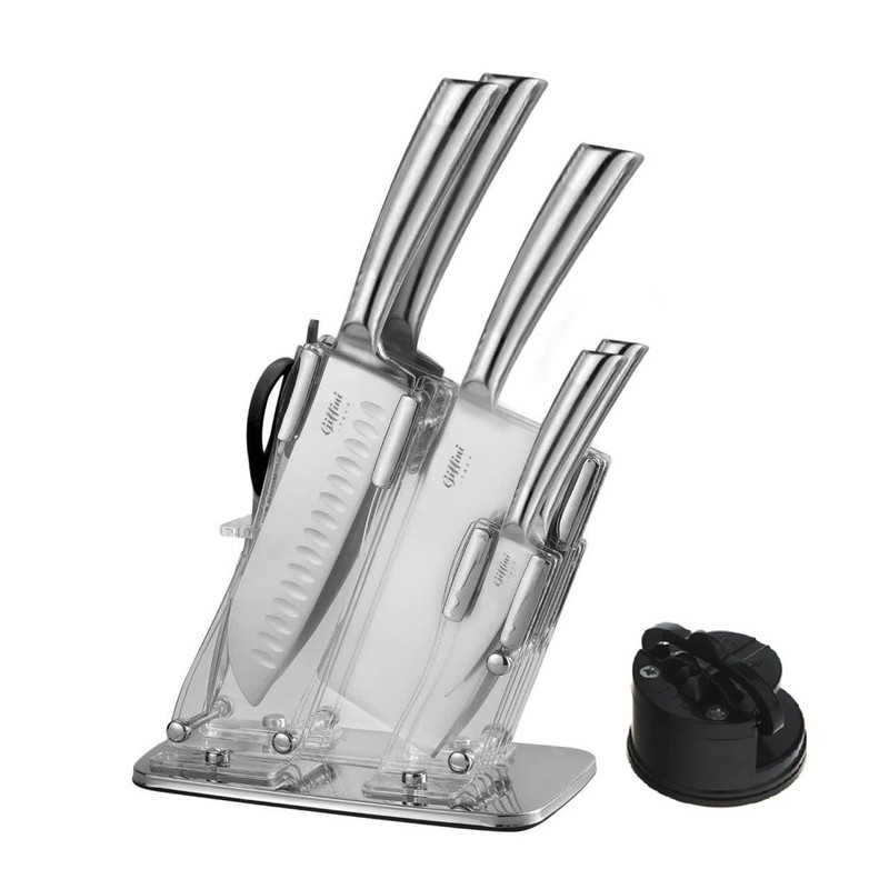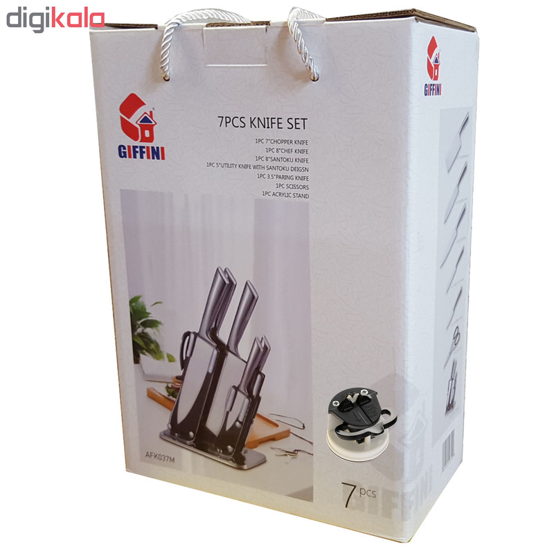 ست چاقو آشپزخانه شامل یک قیچی، یک ساطور، یک چاقوتیزکن، یک پایه نگهدارنده و سه چاقو است که هرکدام با کاربردهای متفاوتشان، هنگام آشپزی به کدبانوی خانه کمک بسزایی خواهند کرد. با استفاده از چاقوهای بزرگ میتوانید انواع گوشت و مرغ را بهسادگی تمیز کرده و بهصورت قطعات کوچکتر خرد کنید و چاقوهای کوچکتر نیز برای خرد کردن سبزیجات و... مناسب هستند. همانطور که در تصاویر دیده میشود، این مدل دارای یک پایه یا استند است که تمام ابزار را در یکجا و در کنار یکدیگر جمع میکند. با قرار دادن پایه روی یکی از کانترهای آشپزخانه، علاوه بر ایجاد ظاهری مدرن و چشمنواز در دکوراسیون محیط، بهسادگی به تمام ابزارها و چاقوهای موردنیازتان دسترسی خواهید داشت. یکی از ویژگیهای جالب این پایه، گردان بودن یا قابلیت چرخش آن است؛ بهاینترتیب با چرخاندن پایه، دسترسی به تمام ابزار داخل پایه برای کدبانوی منزل بسیار آسانتر خواهد شد. اگر بعد از استفادهی مداوم تیغهی چاقوها کُند شد، با تیز کنندهی موجود در این ست، قادر هستید این ابزار را دوباره تیز و بُرنده کنید. چاقوها و ابزار ست مدل GKG7 از کیفیت مطلوبی برخوردار هستند و انتخابی مناسب برای تکمیل جهیزیهی نوعروسان به شمار میآیند