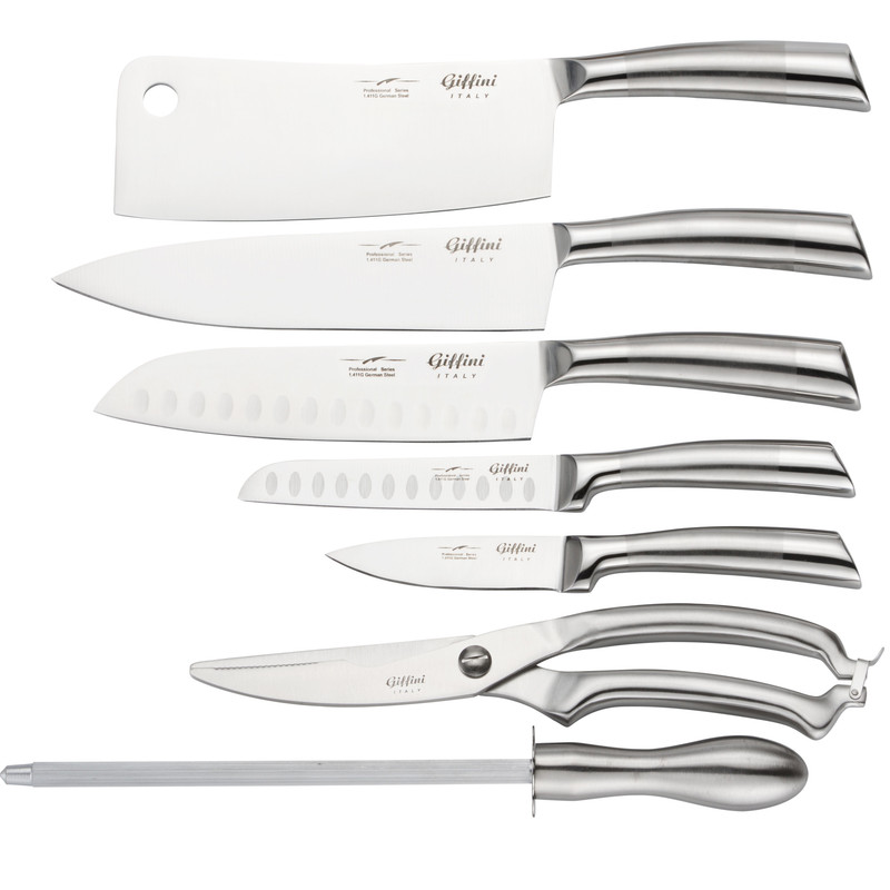 -تیغه وانادیوم تیز شده بوسیله لیزر دقیق -ضریب تیزی ۱۴(بسیار بسیار تیز) -دارای کارد دم دستی و گوشت و سبزی و سرآشپز و ساطور حرفه ای CLEAVER -چاقوی بسیار تیز و عالی -چاقو مخصوص حرفه ای ها -دارای دسته و بدنه یک تکه - داران وزن مناسب و عالی -دارای قیچی یک تکه -دارای کارد سر اشپز برای کار کردن سریع و نچسبیدن در موقع برش زدن.مانند برش گوجه فرنگی -دارای ساطور برش عالی برای گوشت و سبزی (مناسب خردکردن استخوان نمیباشد) -دسته بسیار خوش دست -اصل GIFFINI -تیغه ضخیم و عالی و تیز شده بوسیله لیزر - یک قیچی به طول ۲۱ سانتیمتر - یک ساطور به طول ۳۰.۵ سانتیمتر - یک چاقو برش به طول ۲۴.۵ سانتیمتر - یک چاقو برش به طول ۳۳.۵ سانتیمتر - یک چاقو سرآشپز به طول ۳۰.۵ سانتیمتر -یک چاقو تیزکن(مسقل)