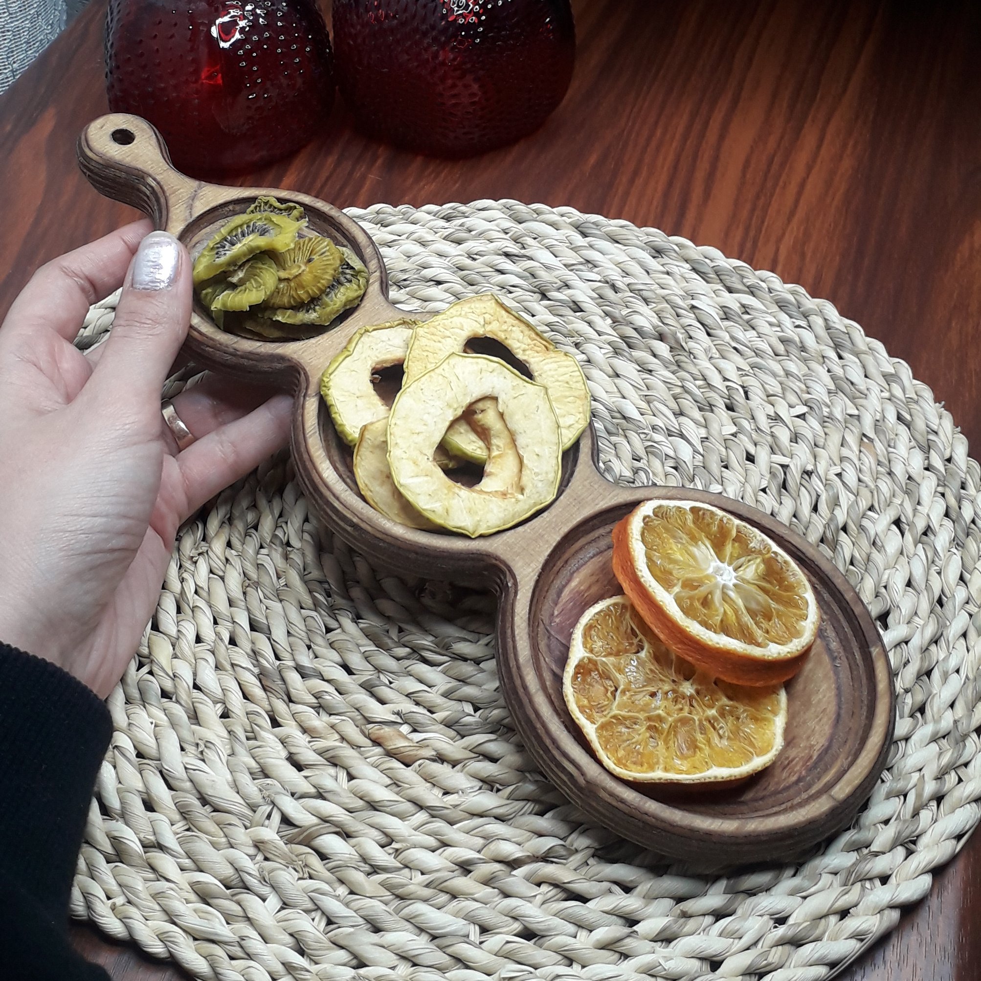 اردوخوری راکتی طرح دایره ۳خانهبسیار باکیفیت قابل شستشو با ضمانت حتی درماشین ظرفشویی بدون حتی کوچیکترین پف کردن یا خراب شدن روغنکاری شده با بهترین روغنهای خوراکی ظرفی مناسب جهت سرو برای دورهمیای بزرگتون رنگ چوب قهوه ایی تیره مناسب سرو انواع تنقلات ،شکلات و..... ابعادبا احتساب دسته ۲۸×۱۰ سانت