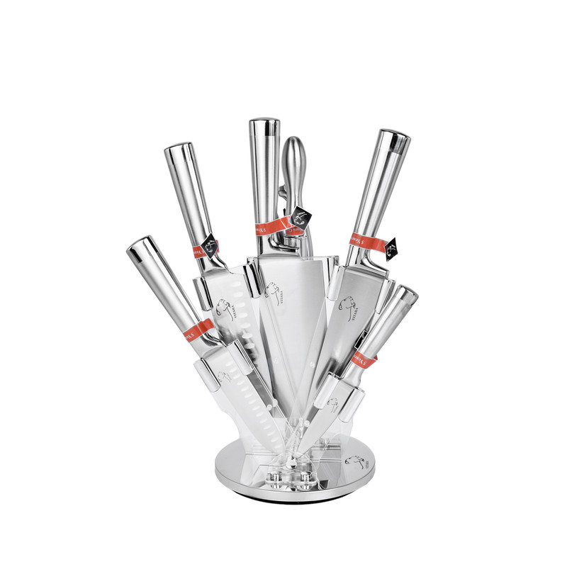 سرویس چاقو ۸ پارچه شامل: ۱ عدد چاقوی سراشپز ۱ عدد چاقوی سن توکیو که بیشتر برای انواع برش های گوشت به اندازه های دقیق و دلخواه ۱ عدد ساطور ۱عدد چاقو تیز کن ۱ عدد قیچی چند منظوره ۱ عدد چاقو برش ۱ عدد چاقوی کوچک میوه و سیبزی جات ۱ عدد استند زیبا و کاربردی جنس محصول از استیل ضد زنگ ۱۸/۱۰ با بالاترین کیفیت - چاقو ها تیز و برنده