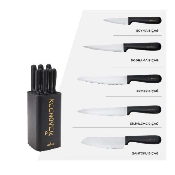 ست چاقوی Karaca Keenover 10 Piece XL که تمام نیازهای شما را برآورده می کند. مجموعه چاقو Keenover XL که به لطف فولاد ضد زنگ خود استفاده بادوام و سالمی را ارائه می دهد، به ل حفظ ظاهر روز اول خود حتی در استفاده طولانی مدت، سال ها مهمان آشپزخانه شما خواهد بود. با چاقوی سانتوکو، چاقوی برش، چاقوی نان، 2 چاقوی خرد کن، 4 چاقوی خرد کن و پایه ای که باعث صرفه جویی در فضای روی پیشخوان می شود،