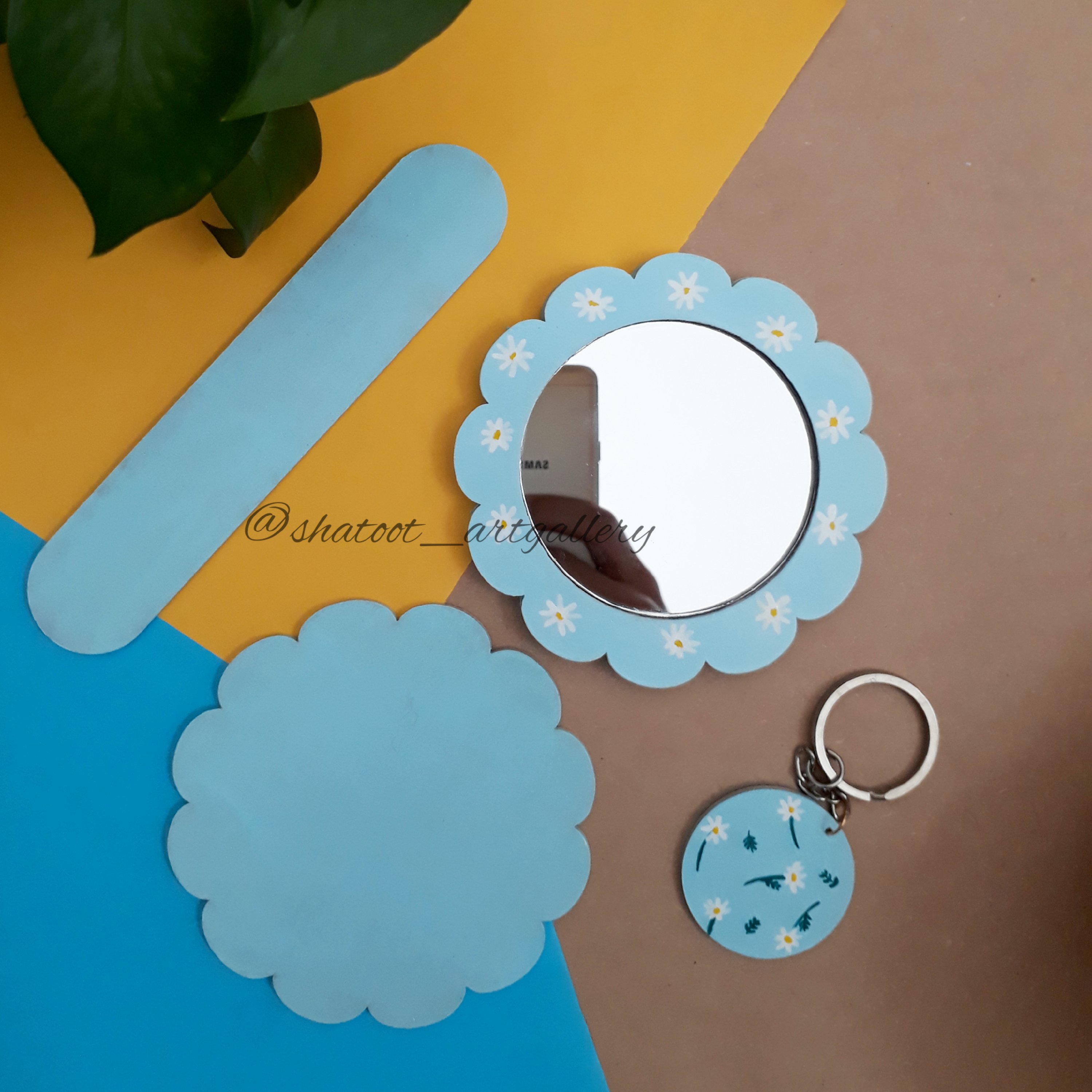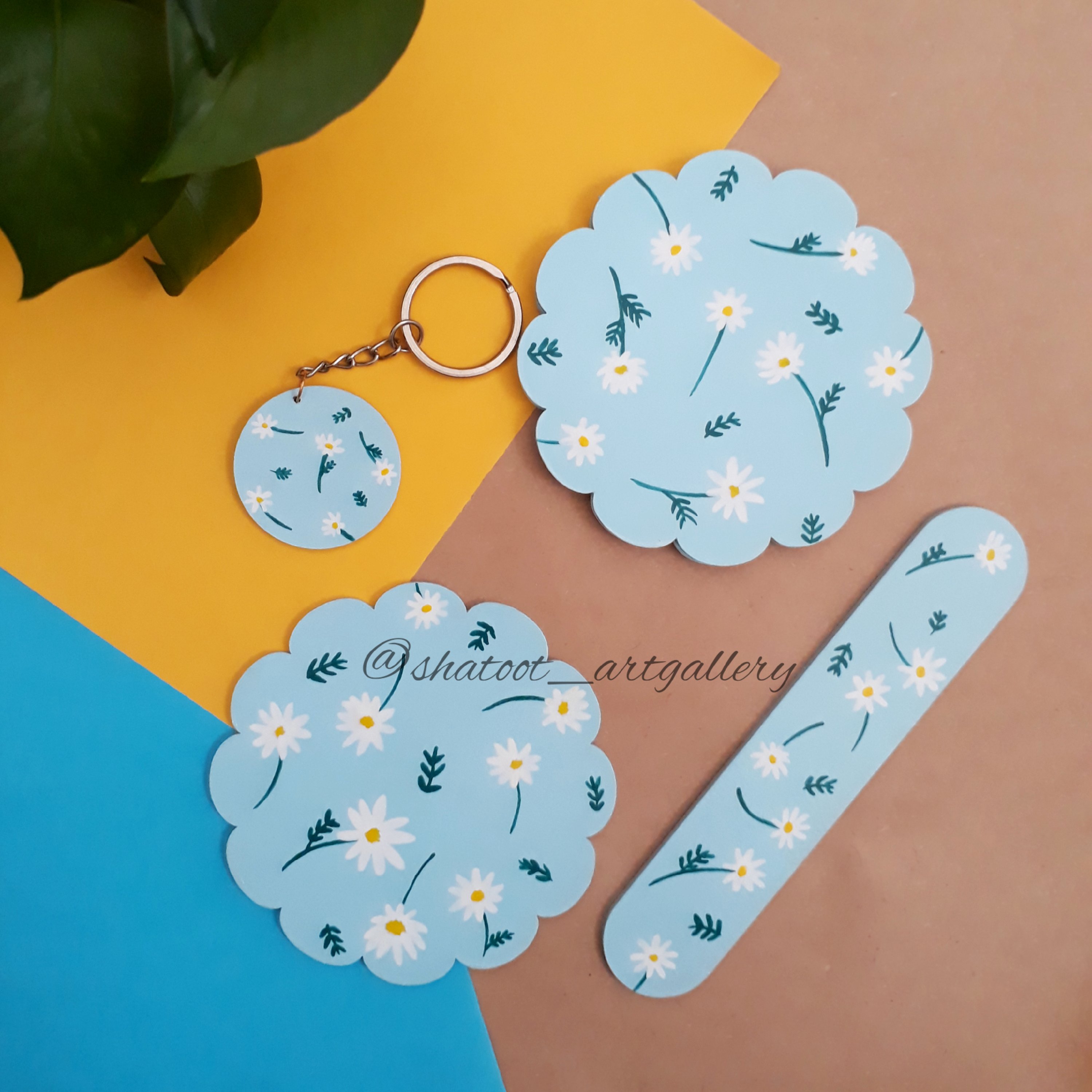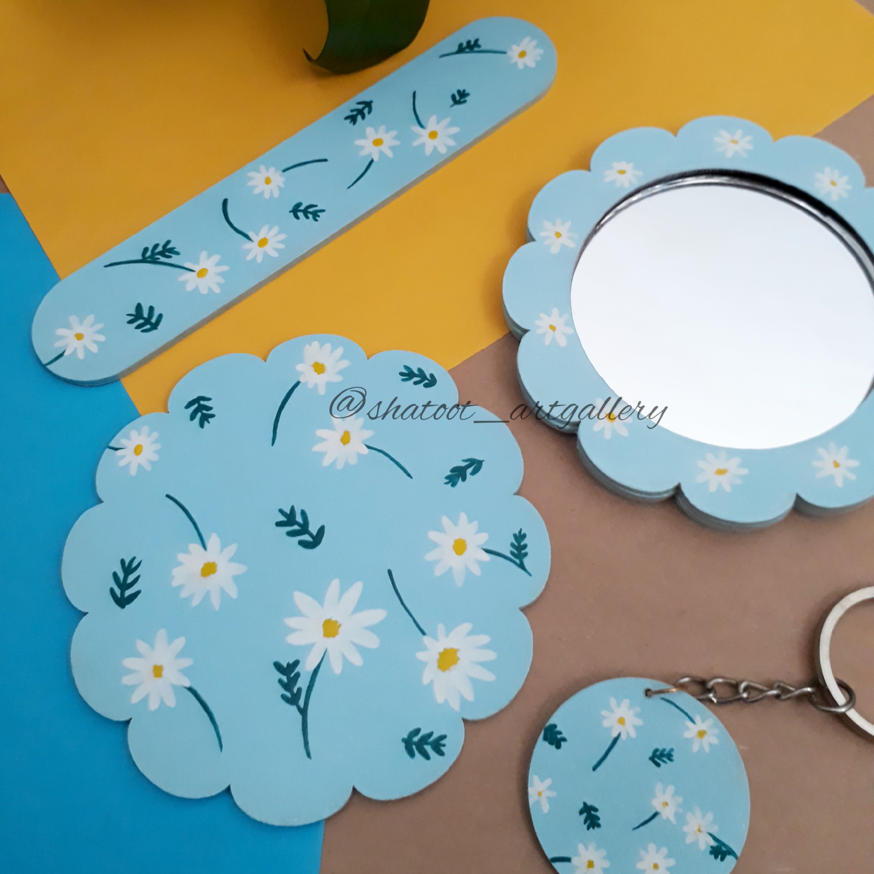 ست چوبی ۴ تکه گل بابونه🌼🌼🌼 🌿 شامل آینه جیبی، زیرلیوانی، نشانگر کتاب، جاسوئیچی 🌿رنگ آمیزی شده با رنگ اکریلیک 🌿ضدآب و براق شده با آلتیمیت گلیز 🌿با دستمال نمدار قابل تمیز کردن هست 🌿در طرح و رنگ های دیگر هم قابل سفارش می باشد