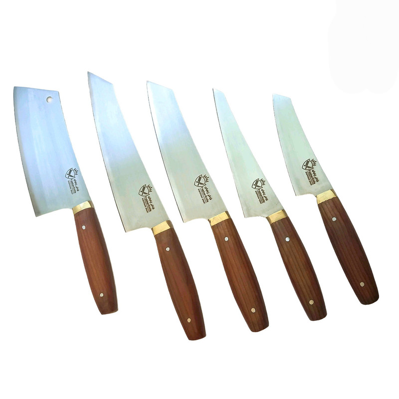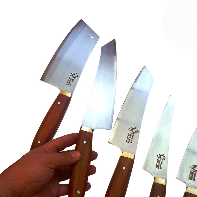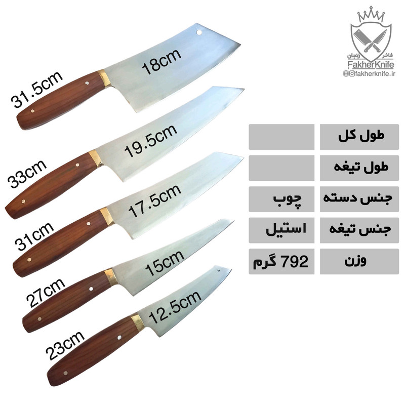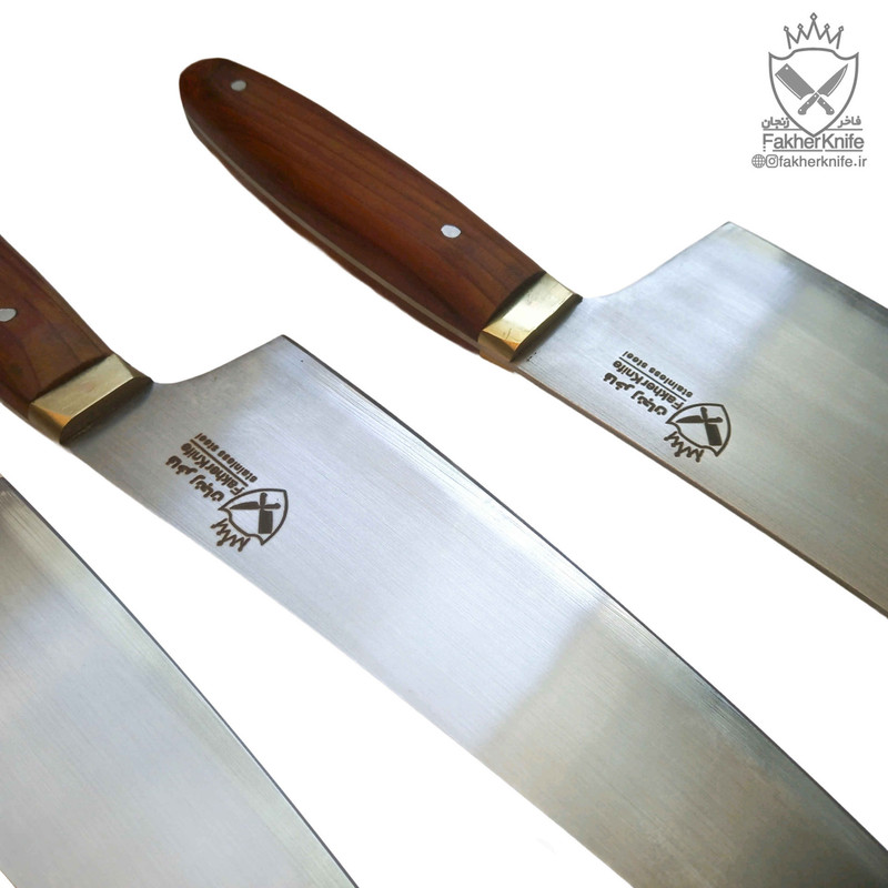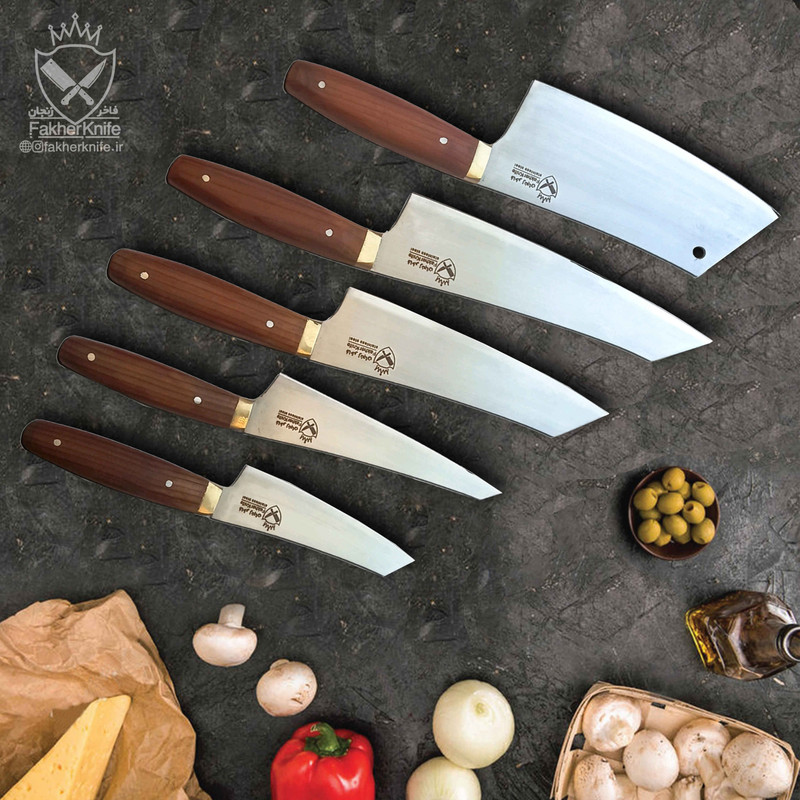 این ست 5 پارچه با الگو برداری از چاقوی های ژاپنی دارای زیبایی ومی خاص و منحصر به فردی می باشد این ست بسیار تیز و پر کاربرد می باشد و دارای 5 چاقوی پر کاربرد آشپزخانه می باشد و برای استفاده در منزل، وران و کادویی و جهیزیه عروس گزینه مناسبی می باشد. ساطور این ست برای برش گوشت و تکه کردن آن و سبزیجات استفاده دارد چاقوی سرآشپز برای برش سبزیجات و گوشت استفاده دارد چاقوی راسته که برای خرد کردن مرغ و تکه کردن گوشت و ریز ریز کردن ان استفاده دارد چاقوی فیله برای بی خس کردن و ماهی کاربرد دارد چاقوی دم دستی برای کارهای معمولی و عادی آشپزخانه کاربرد دارد جنس تیغه این محصول از استیل می باشد که نه سیاه می شود و نه زنگ میزند و تیزی ثابتی دارد و جنس دسته این محصول از چوب مرغوب و با کیفیت ترمو وود می باشدکه دربرابرآب کیفیت ثابتی دارد
