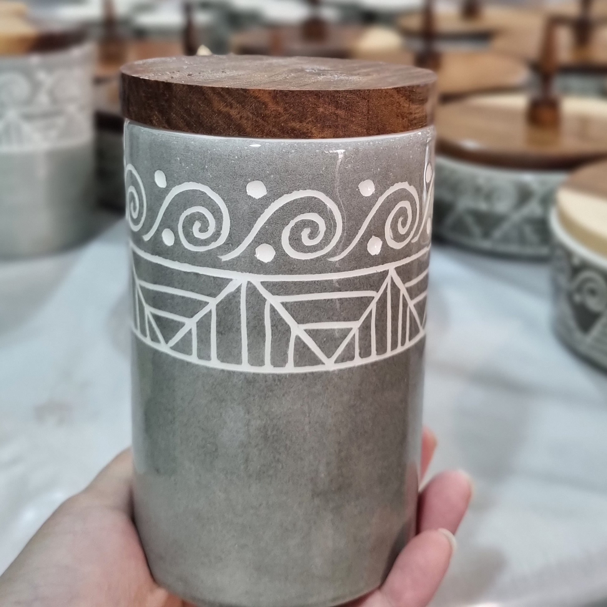 شکلات خوری و بانکه استوانه ای قطر 8 سانت سرامیکی دستساز طرح موج رنگ طوسی توانا سرام مبلمونسرا مدل 296605