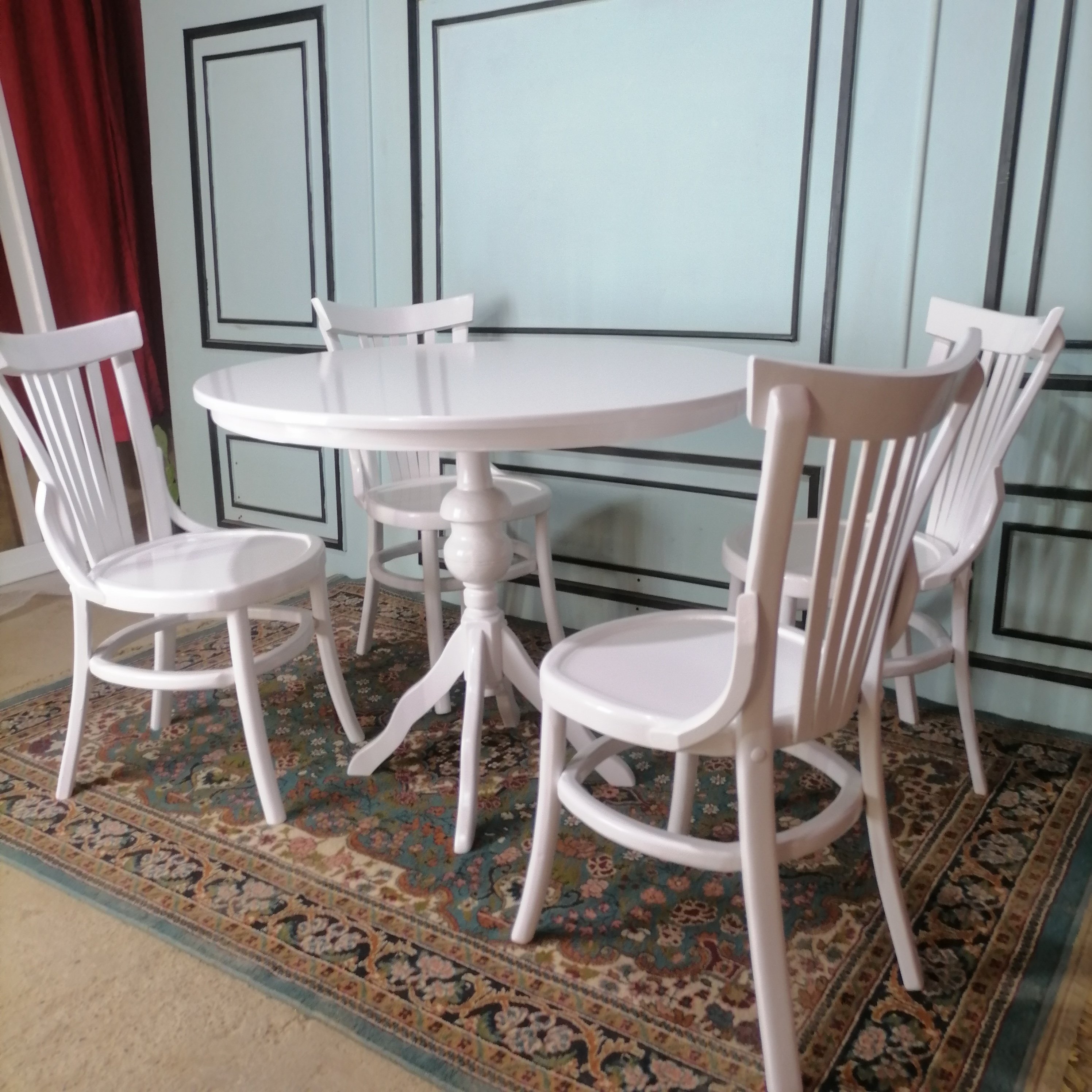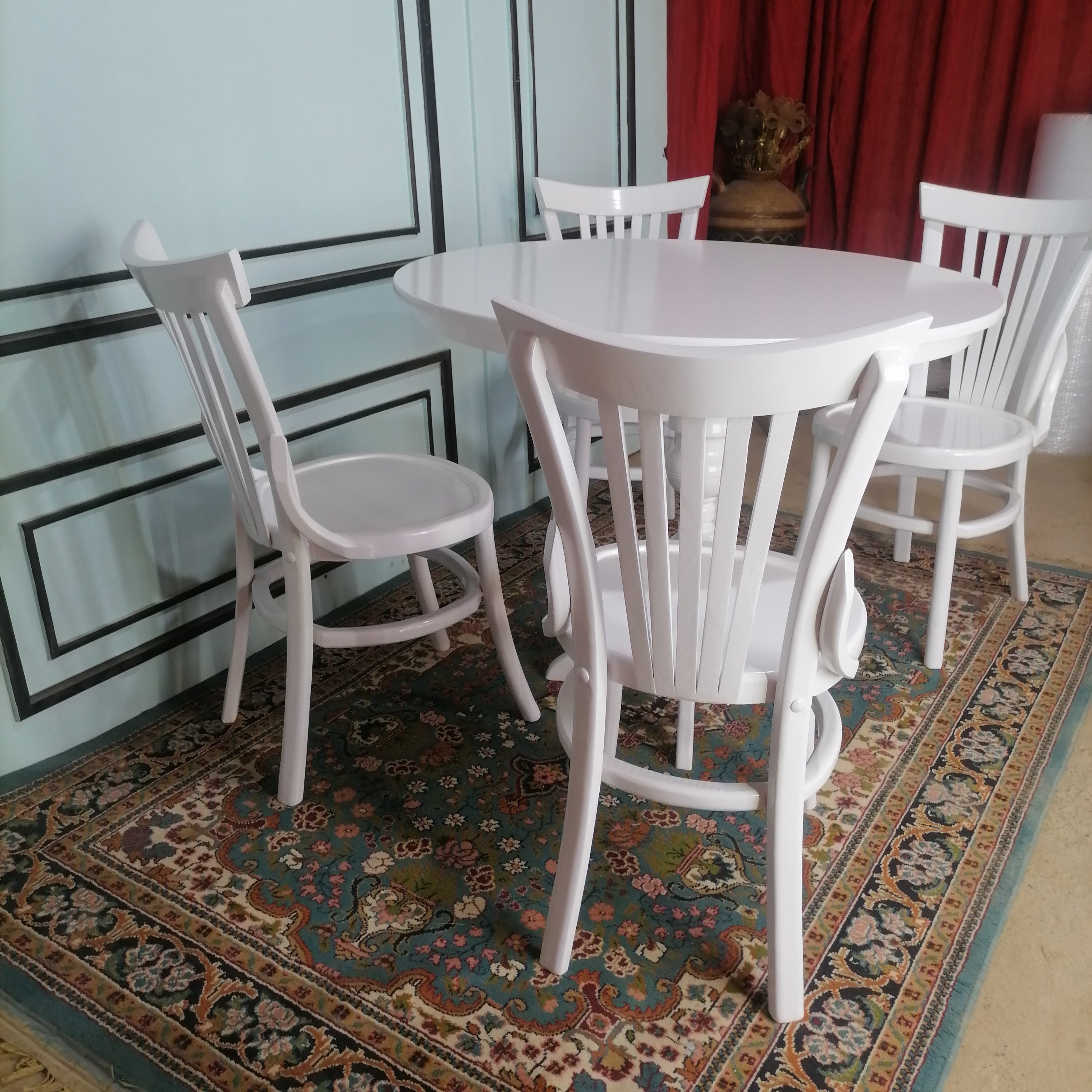 ناهارخوری 4 نفره با میزگرد سفید🪑 این ناهارخوری شامل : 4 عدد صندلی ،میزگرد با قطر 100 سانتی متر میباشد. رنگ تصویر سفیده ولی رنگبندی کاملا دلخواه شماست 🌈 متریال 🪵 چوب توسکا تحویل 21 روزه ارسال به سراسر کشور داریم 🚛 هزینه ارسال به عهده مشتری و به صورت میباشد .