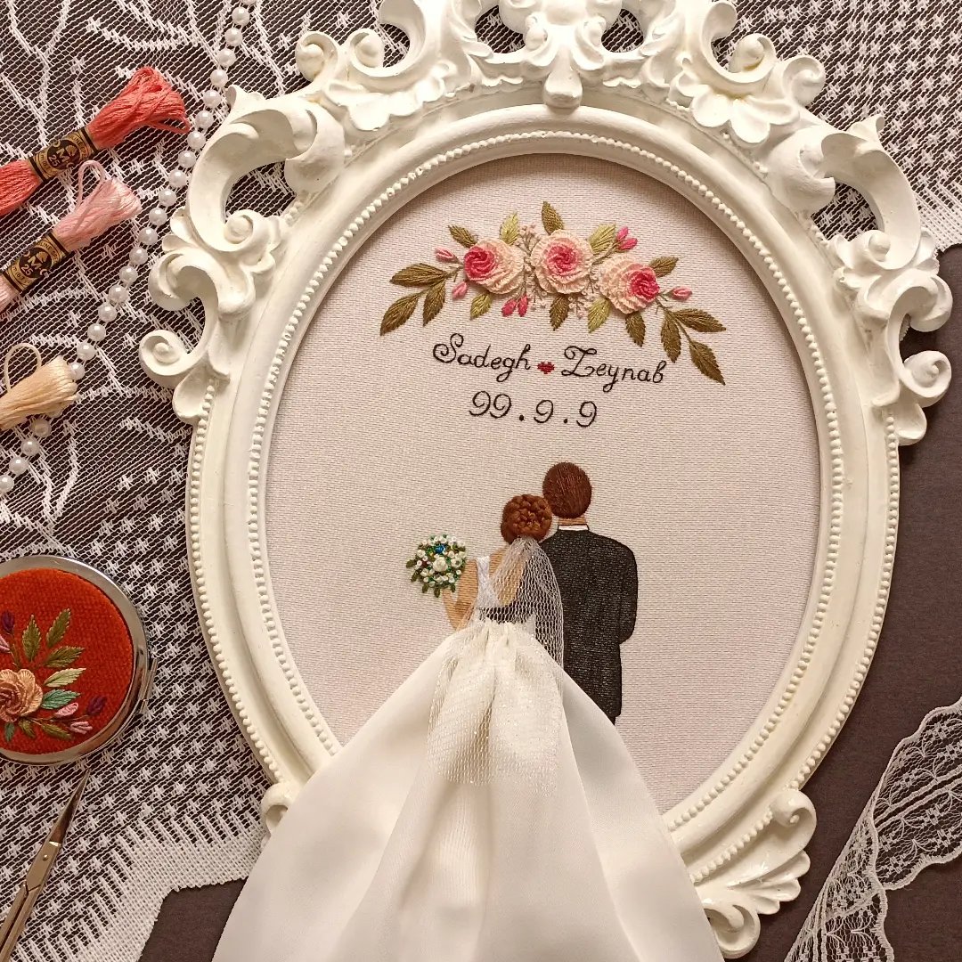 دیوارکوب عروس و داماد یادبود سالگرد ازدواج با قاب پلی استر گلدوزی شده با دست کد 077 مبلمونسرا مدل 259840