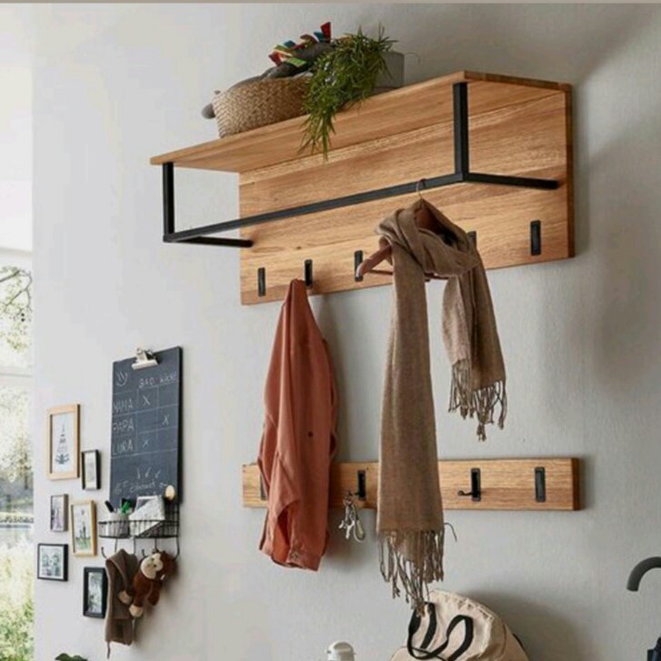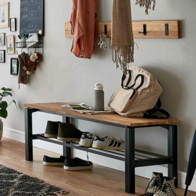 نیمکت چوبی با پایه فولادی جاکفشی دار همراه با جالباسی سه تیکه و جای دکور مطابق عکس
