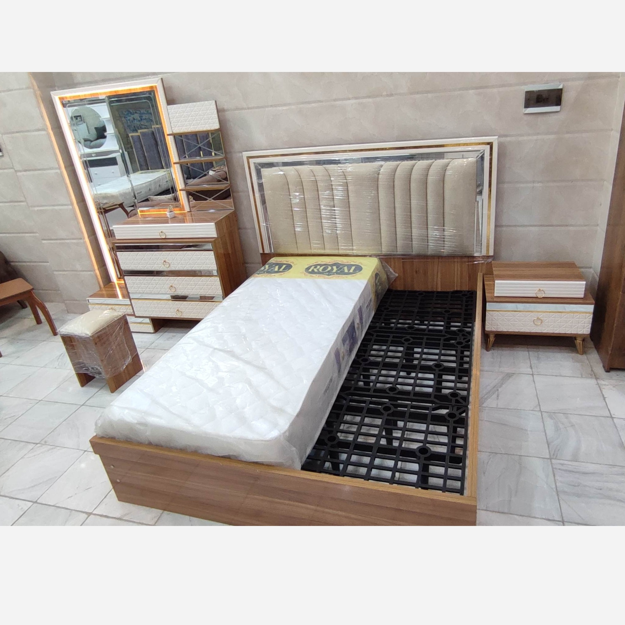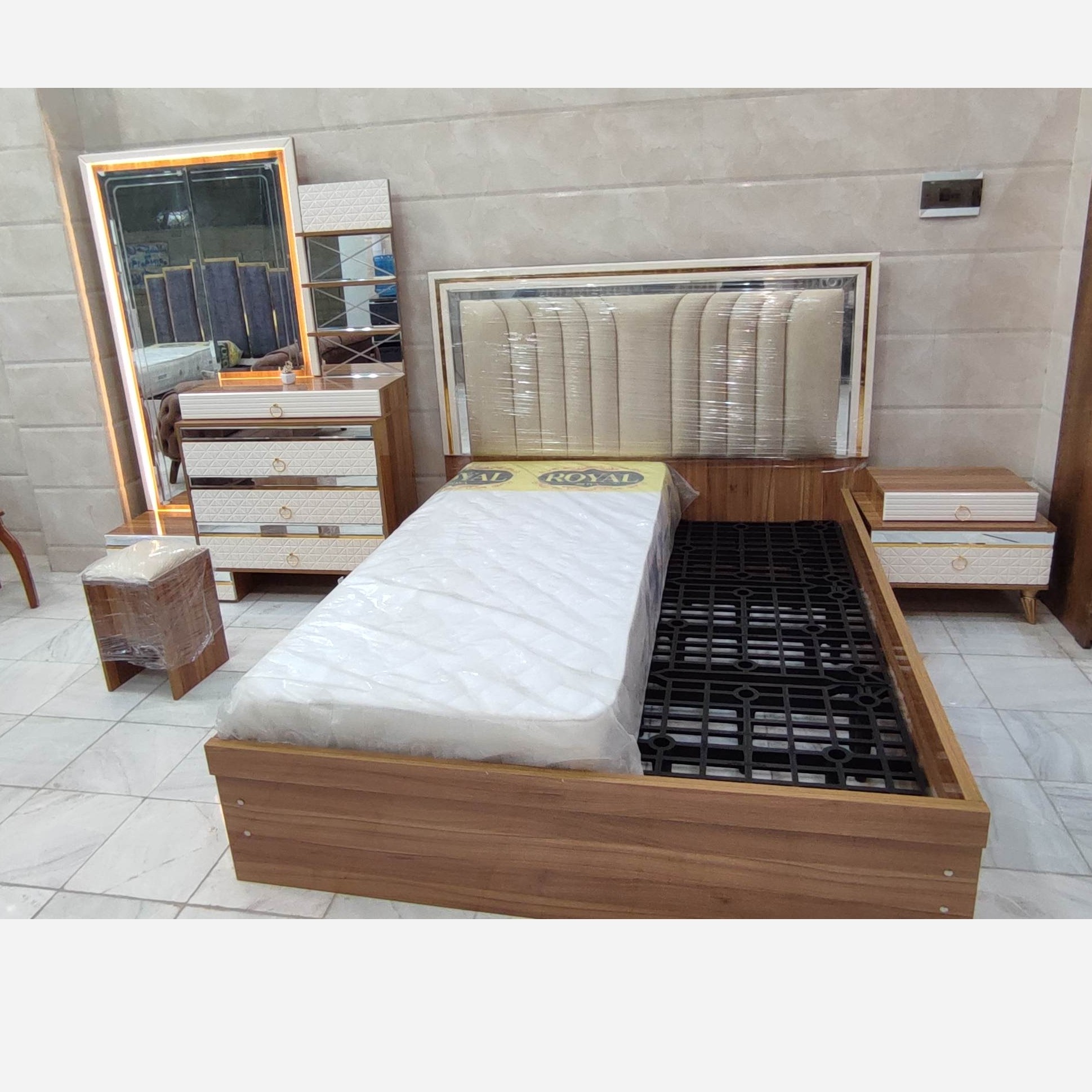 سرویس دونفره تختخواب مدل A4 مناسب جهیزیه عروس با 2 تنوع رنگبندی گردویی کرم و سفید طوسی میز ارایش 5 تیکه قابل حمل و نصب اسان دارای اینه قدی و نور پردازی فوق االعاده جادار با عمق کشاب 15 سایز تخت 160/ میز ارایش پ عسلی/ اینه قدی/1 پاتختی 2 کشو/کفی تخت